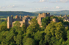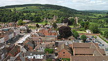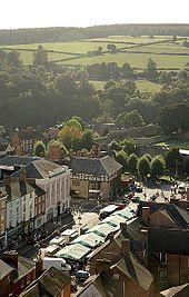 The town is near the confluence of the rivers Corve and Teme. The oldest part is the medieval walled town, founded in the late 11th century after the Norman conquest of England. It is centred on a small hill which lies on the eastern bank of a bend of the River Teme. Situated on this hill are Ludlow Castle and the parish church, St Laurence's, the largest in the county.[2] From there the streets slope downward to the River Teme, and northward toward the River Corve. The town is in a sheltered spot beneath Mortimer Forest and the Clee Hills, which are clearly visible from the town.[3]