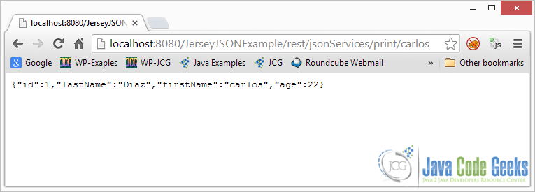 package com.javacodegeeks.enterprise.rest.jersey; import javax.ws.rs.GET; import javax.ws.rs.POST; import javax.ws.rs.Path; import javax.ws.rs.PathParam; import javax.ws.rs.Produces; import javax.ws.rs.Consumes; import javax.ws.rs.core.MediaType; import javax.ws.rs.core.Response; @Path("/jsonServices") public class JerseyRestService { @GET @Path("/print/{name}") @Produces(MediaType.APPLICATION_JSON) public Student produceJSON( @PathParam("name") String name ) { Student st = new Student(name, "Diaz",22,1); return st; } }After deploying the application, open your browser and go to: