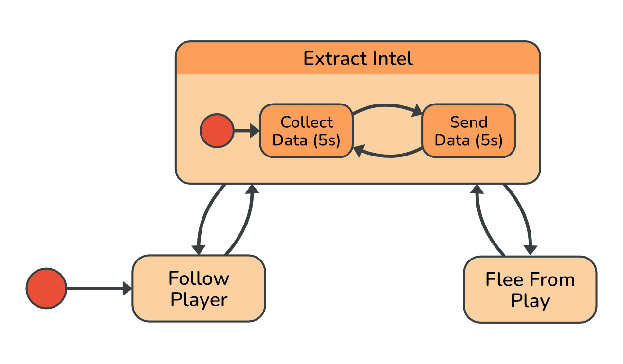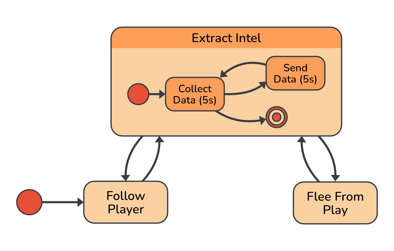 void Start() { fsm = new StateMachine(); fsm.AddState("ExtractIntel"); fsm.AddState("FollowPlayer", onLogic: state => MoveTowardsPlayer(1)); fsm.AddState("FleeFromPlayer", onLogic: state => MoveTowardsPlayer(-1)); fsm.SetStartState("FollowPlayer"); fsm.AddTwoWayTransition("ExtractIntel", "FollowPlayer", transition => DistanceToPlayer > ownScanningRange); fsm.AddTwoWayTransition("ExtractIntel", "FleeFromPlayer", transition => DistanceToPlayer < playerScanningRange); fsm.Init(); }When dealing with more complex behaviour, it is natural to break the problem down into sub-problems. This approach maps beautifully to state machines. First you define the states and then in a later step you can add the logic and behaviour to them. When designing a state, it can sometimes be useful to draw another state diagram just for it and to think about how you can break down its behaviour. The result of this is a hierarchy of states - a hierarchical state machine.