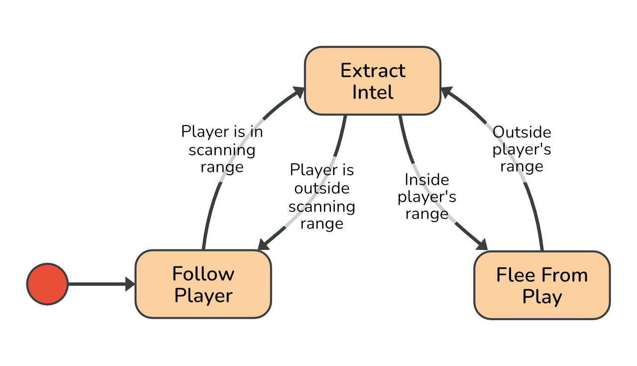 fsm.AddTwoWayTransition("ExtractIntel", "FollowPlayer", transition => DistanceToPlayer > ownScanningRange); fsm.AddTwoWayTransition("ExtractIntel", "FleeFromPlayer", transition => DistanceToPlayer < playerScanningRange);void Start() { // ... // Initializes the state machine and must be called before OnLogic() // is called. fsm.Init(); } void Update() { fsm.OnLogic(); }At this point, the basic version of the enemy controller is finished and ready to use :D