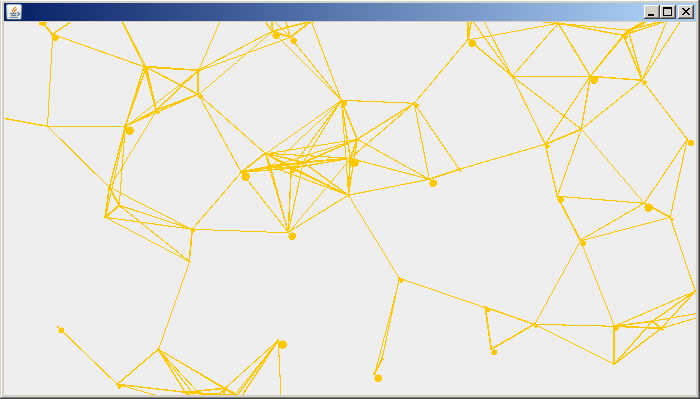public class Stars { public static void main(String[] args) { new Stars().start(); } void start() { Runnable background = new SkyThread(); Thread skyThread = new Thread(background); skyThread.start(); System.out.println("Конец"); } }import javax.swing.*; public class SkyThread implements Runnable { JFrame frame; @Override public void run() { frame = new JFrame(); Sky sky = new Sky(80); frame.getContentPane().add(sky); frame.setDefaultCloseOperation(JFrame.EXIT_ON_CLOSE); frame.setSize(700, 400); frame.setVisible(true); while (true) { //Любое число итераций для проверки frame.repaint(); sky.setStep(); try { Thread.sleep(80); } catch (Exception a) {a.printStackTrace();} } } }import javax.swing.*; import java.awt.*; public class Sky extends JPanel { int[] x0; // Точки начала координат, и координаты прямой. int[] y0; int[] x, X; int[] y, Y; int[] k; // Коэффициент функции прямой int[] randStep; // Флаг для Х private int quan; int[] diameter; public Sky(){ this(2); // Объект по-умолчанию } public Sky(int quantity){ //Не защищён от отр. значений quan = quantity; x0 = new int[quan]; y0 = new int[quan]; x = new int[quan]; y = new int[quan]; X = new int[quan]; Y = new int[quan]; k = new int[quan]; randStep = new int[quan]; diameter = new int[quan]; for (int i=0; i<quan; i++) { x0[i] = (int) ((Math.random() * 650) + 30); y0[i] = (int) ((Math.random() * 350) + 30); // Генерируем точку начала координат k[i] = (int) ((Math.random() * 10) - 5); // C коэффициентом надо разобраться. Добиться попадания в [-10..10] //System.out.println(x0 + " " + k); randStep[i] = (int) (Math.random() * 2); diameter[i] = (int) (Math.random() * 10); } } public void paintComponent(Graphics a) { a.setColor(Color.orange); Graphics2D a2 = (Graphics2D) a; //Получаем X и Y - для удобства for (int i=0; i<quan; i++) { X[i] = x[i] + x0[i]; Y[i] = y[i] + y0[i]; } //Рисуем for (int i=0; i<quan; i++) { a.fillOval(X[i], Y[i], diameter[i], diameter[i]); //Круг for (int j=0; j<quan; j++){ double distance = Math.sqrt((X[j]-X[i])*(X[j]-X[i]) + (Y[j]-Y[i])*(Y[j] - Y[i])); // Расстояние отрезка if(distance < 100) { if(distance > 90) a2.setStroke(new BasicStroke(1.0f)); // толщина равна 1,5 else if(distance > 70) a2.setStroke(new BasicStroke(1.1f)); else if(distance > 50) a2.setStroke(new BasicStroke(1.4f)); else if(distance > 30) a2.setStroke(new BasicStroke(1.6f)); else if(distance > 10) a2.setStroke(new BasicStroke(1.8f)); else if(distance >=0 ) a2.setStroke(new BasicStroke(2.0f)); a2.drawLine(X[i], Y[i], X[j], Y[j]); //Линия } } } } //Движение звёздочки public void setStep() { for (int i=0; i<quan; i++){ if (randStep[i] == 1) { if ((Y[i] > 430) && (X[i] < 730)) {x0[i] = X[i]; x[i] = 0; y0[i] = 0; y[i] = 0;} //Сброс коорд. и смещение оси else if ((Y[i] < 430) && (X[i] > 730)) {x0[i] = 0; x[i] = 0; y0[i] = Y[i]; y[i] = 0;} // else if ((Y[i] > 430) && (X[i] > 730)) {x0[i] = 0; x[i] = 0; y0[i] = 0; y[i] = 0;} x[i]++; } else { if ((Y[i] < -30) && (X[i] < 730)) {x0[i] = X[i]; x[i] = 0; y0[i] = 430; y[i] = 0;} else if ((Y[i] < 430) && (X[i] < -30)) {x0[i] = 730; x[i] = 0; y[0] = Y[i]; y[i] = 0;} else if ((Y[i] > 430) && (X[i] > -30)) {x0[i] = X[i]; x[i] = 0; y0[i] = 0; y[i] = 0;} x[i]--; } y[i] = k[i] * x[i]; System.out.println(X[i] + " " + Y[i]); } } // Конец setStep }