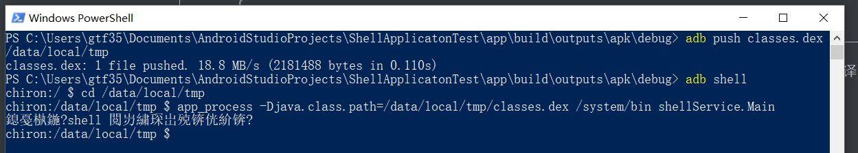 adb push classes.dex /data/local/tmp cd /data/local/tmp app_process -Djava.class.path=/data/local/tmp/classes.dex /system/bin shellService.Main这时就能看到已经成功运行啦: