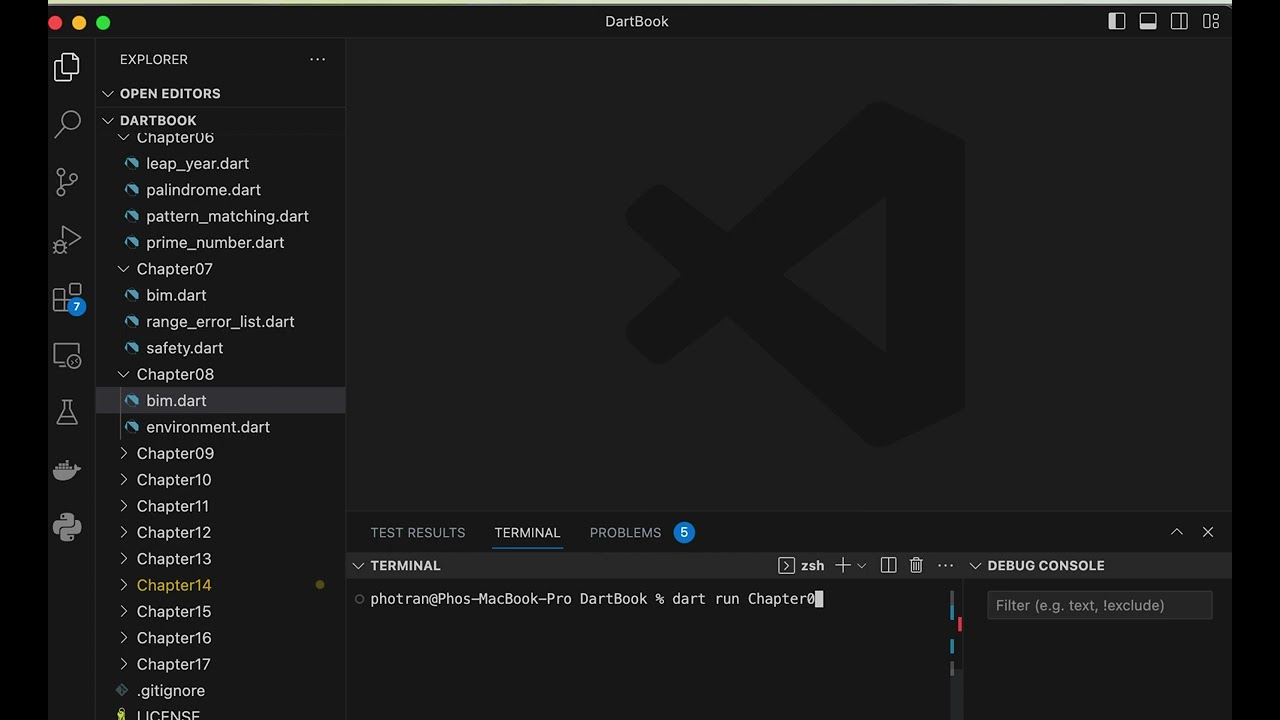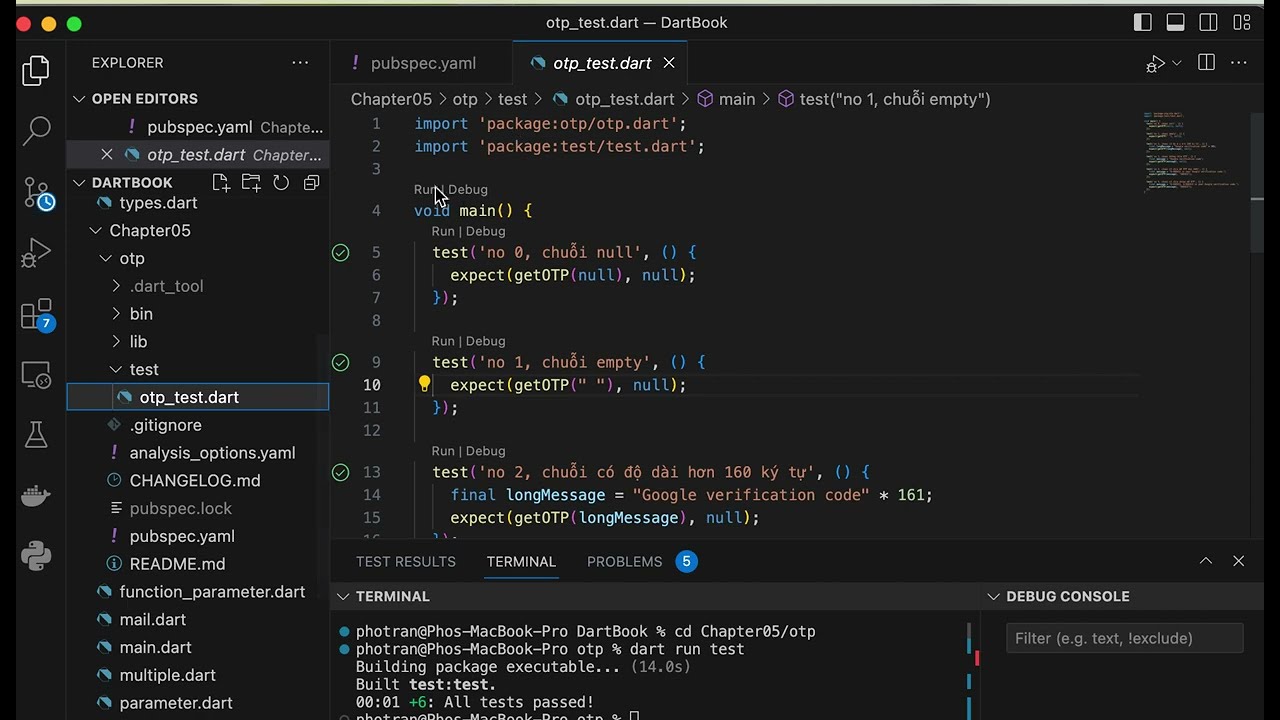 Dart Book Bắt đầu lập trình Dart Hướng dẫn Chương Video minh hoạ 1 chapter01.mov 5 Hàm main chapter05_main.mov Unit test 8 BMI console 12 DartJ Thao tác DartJ và JSON dartj_freezed.mp4 Thao tác DartJ gen code class freezed 14 ChatGPT