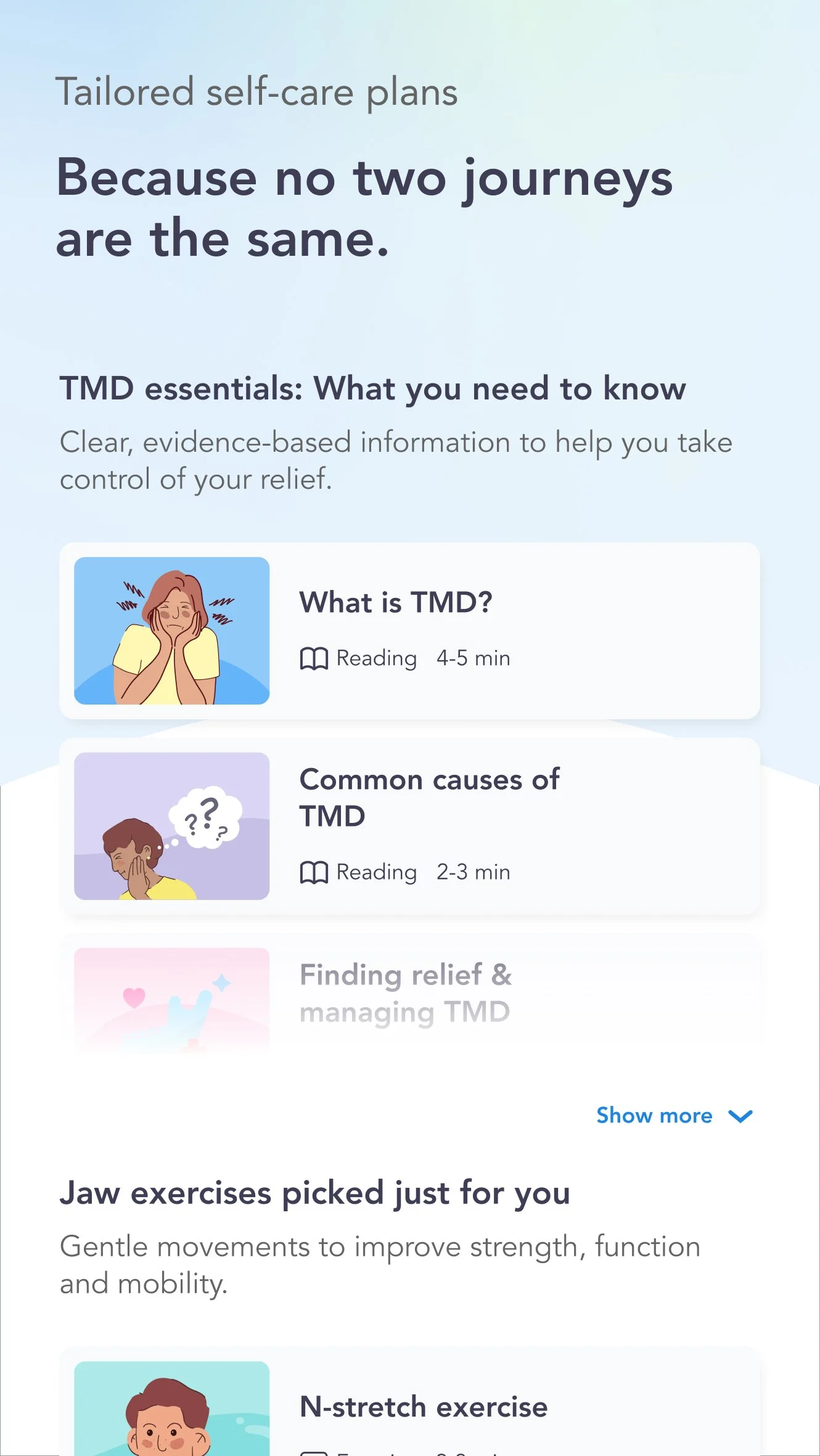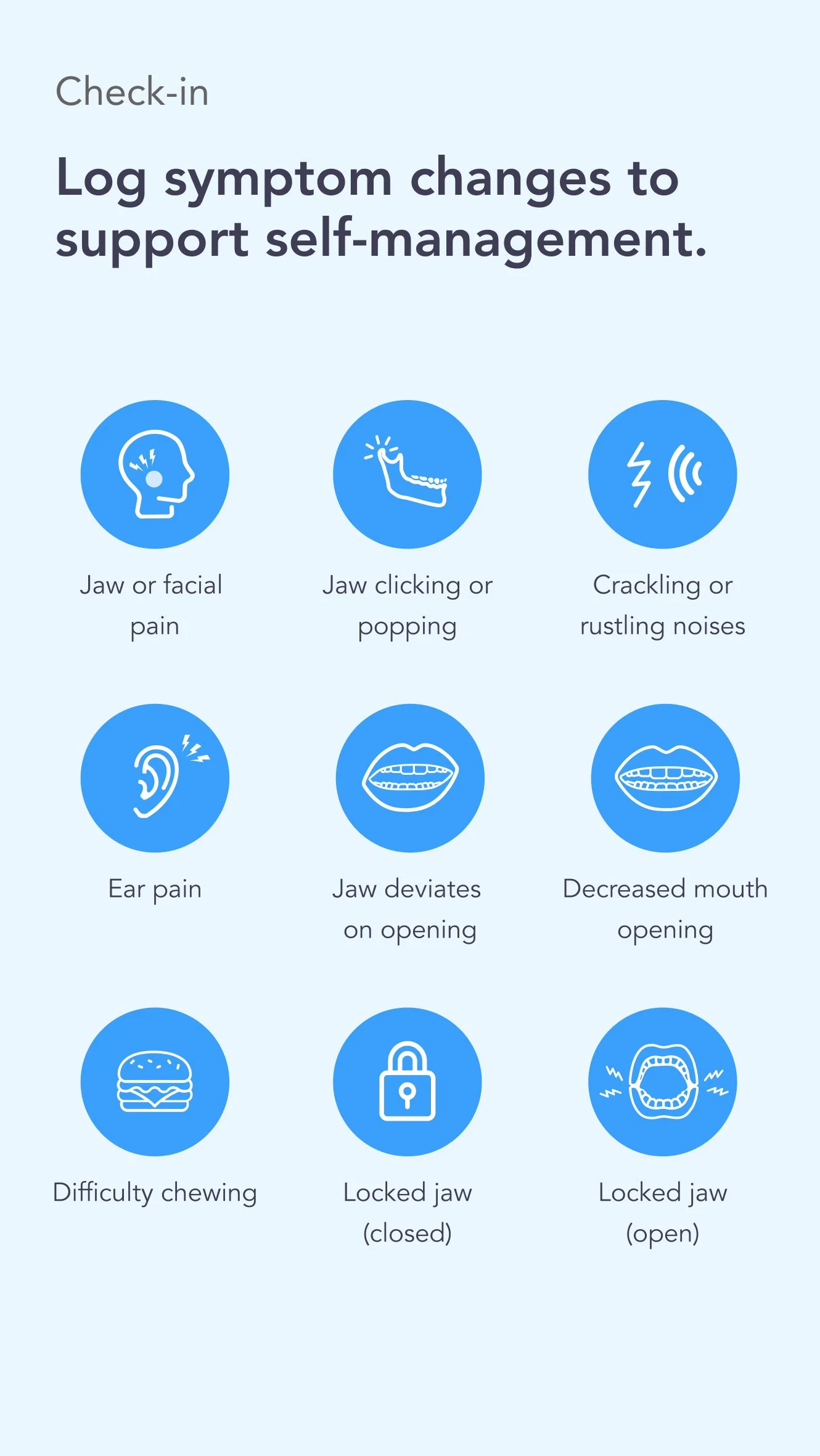 Tailored self-management plan: Receive a personalized plan based on your specific TMD type and inputted symptoms (available only for users with a confirmed TMD diagnosis).