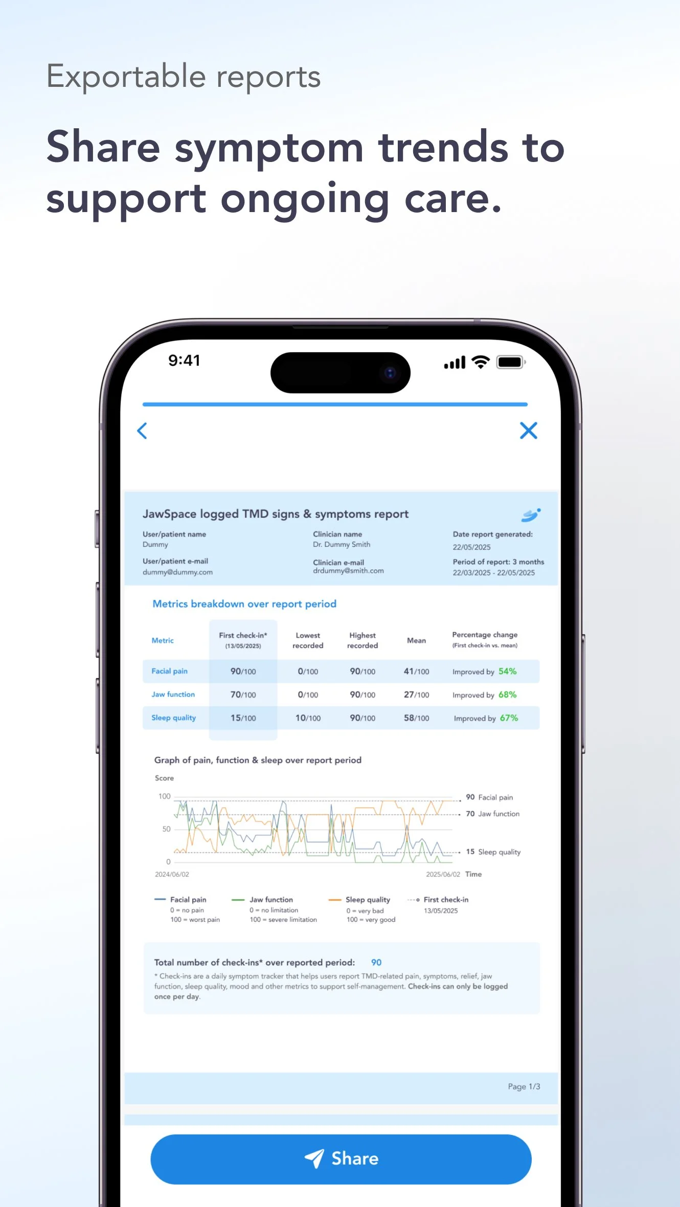 Once access is provided, patients use JawSpace independently between appointments to support their self-management, with evidence-based education, guided exercises, symptom tracking, and practical self-care tools.