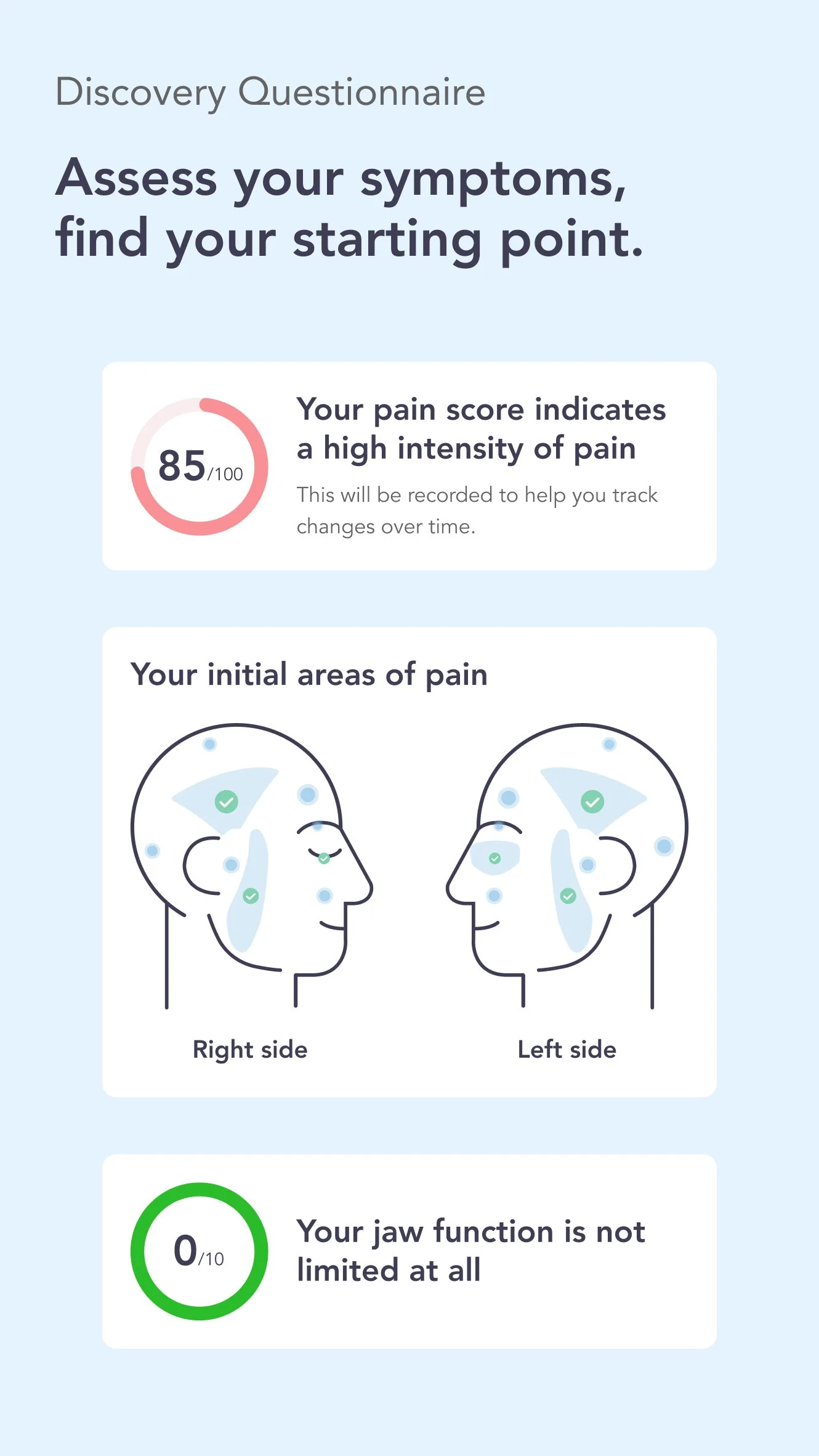 Complete a guided questionnaire designed to help build an understanding of your TMD symptoms and inform your personalised self-management plan. This feature is available as part of our registered medical device version (SaMD) in the United Kingdom and Australia.