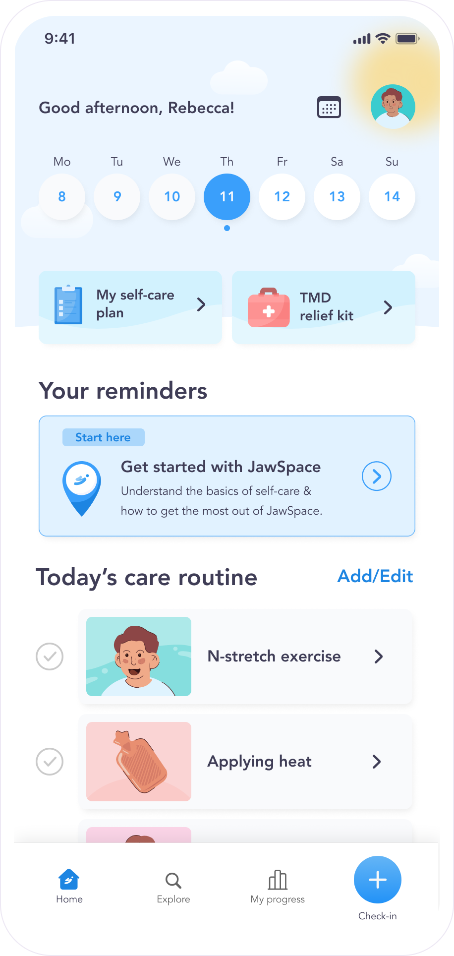 Self-care and self-management are the first steps in TMD treatment before considering more invasive options. JawSpace provides a structured, evidence-based approach to TMD self-management, offering guided exercises, habit tracking, symptom check-ins, and educational resources tailored to your needs. By helping you understand your symptoms and build healthier jaw habits, JawSpace empowers you to take control of your jaw health and improve your daily well-being.