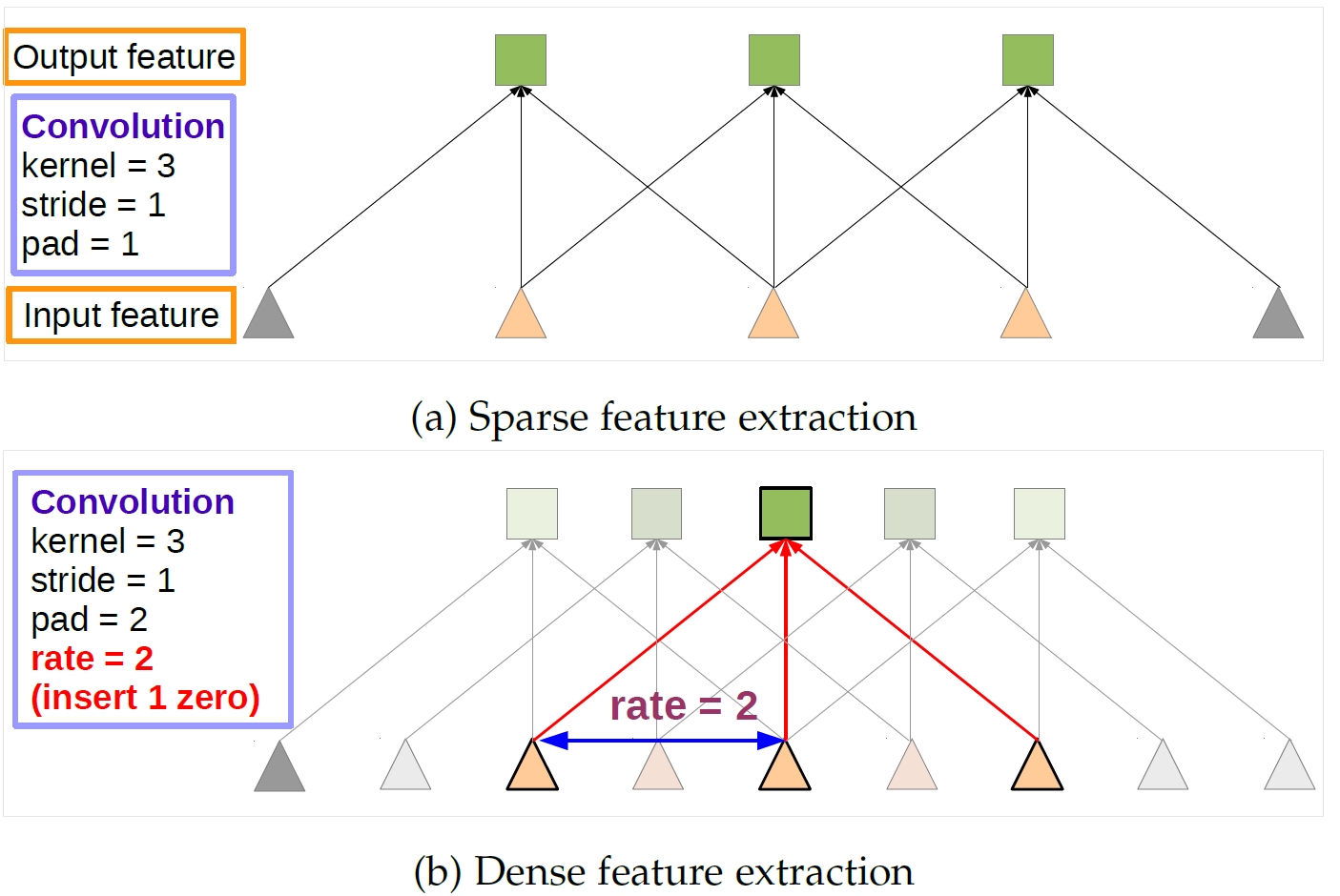 Illustration of dense feature extraction in 1-D. (a) Sparse feature extraction with standard convolution on a low resolution input feature map. (b) Dense feature extraction with atrous convolution with rate r = 2, applied on a high resolution input feature map.