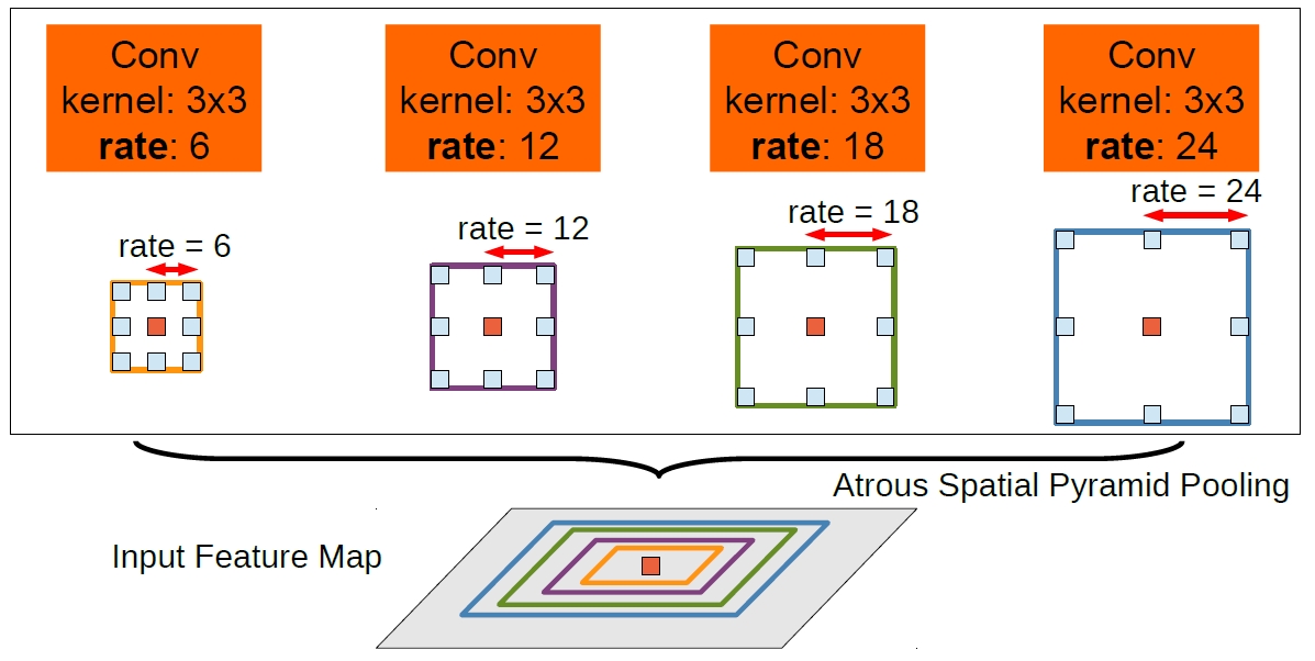 To classify the center pixel (orange), Atrous Spatial Pyramid Pooling exploits multi-scale features by employing multiple parallel filters with different rates. The effective Field-Of-Views are shown in different colors.