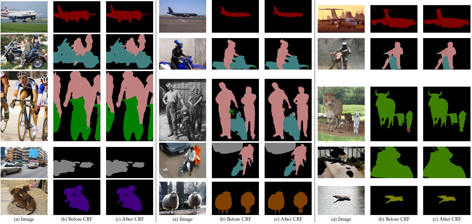 In this figure, we show some PASCAL VOC 2012 segmentation results by our DeepLab before and after CRF.