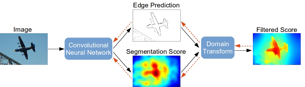Deep convolutional neural networks (CNNs) are the backbone of state-of-art semantic image segmentation systems. Recent work has shown that complementing CNNs with fully-connected conditional random fields (CRFs) can significantly enhance their object localization accuracy, yet dense CRF inference is computationally expensive. We propose replacing the fully-connected CRF with domain transform (DT), a modern edge-preserving filtering method in which the amount of smoothing is controlled by a reference edge map. Domain transform filtering is several times faster than dense CRF inference and we show that it yields comparable semantic segmentation results, accurately capturing object boundaries. Importantly, our formulation allows learning the reference edge map from intermediate CNN features instead of using the image gradient magnitude as in standard DT filtering. This produces task-specific edges in an end-to-end trainable system optimizing the target semantic segmentation quality.