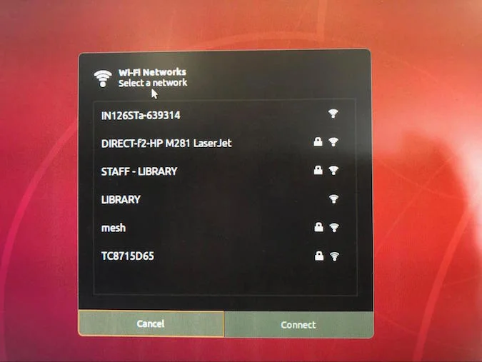 4. Once the computer has booted from USB, I am presented with a "live user" session on the particular Linux distribution I have chosen. Your particular distribution might look slightly different. The first thing I always check is to ensure that I have a wired and/or wireless connection to the network and internet. This particular distribution is a Gnome3 desktop, and those icons are at the top right of my display.