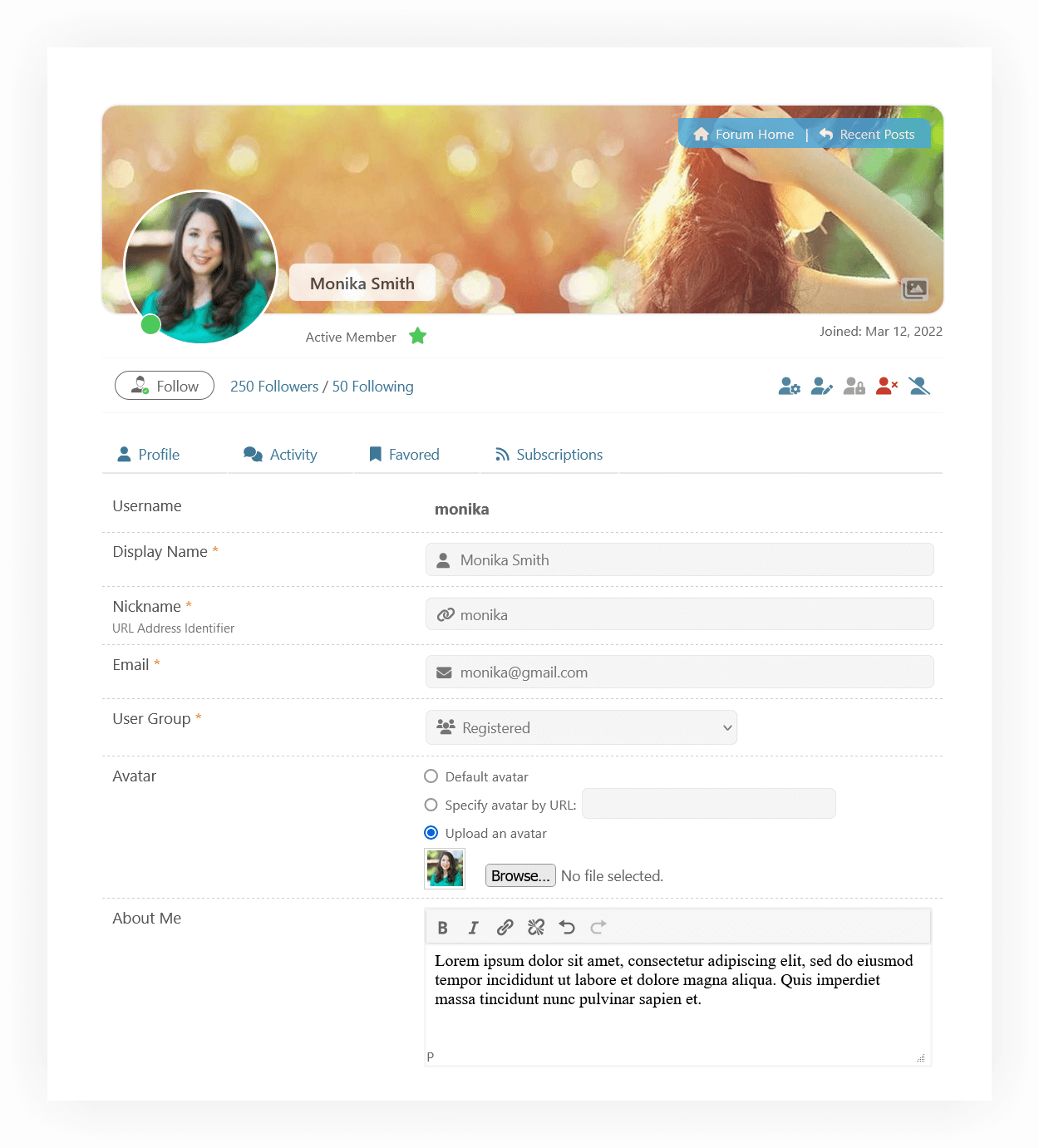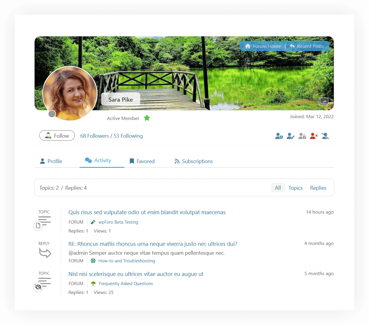 Powerful and beautiful profile system, with member statistic, settings, activity and subscriptions tabs.
