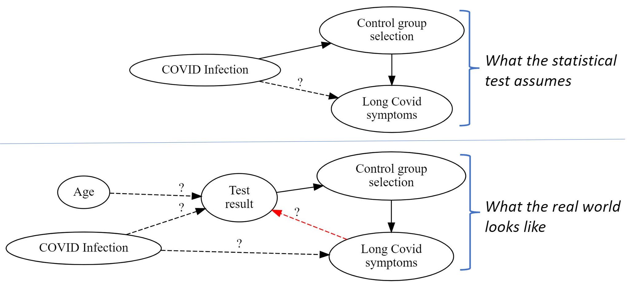 Statistical tests need to be paired with proper data and study design to yield valid results. A recent review paper on Long Covid in children provides a useful example of how researchers can get this wrong. We use causal diagrams to decompose the problem and illustrate where errors were made.