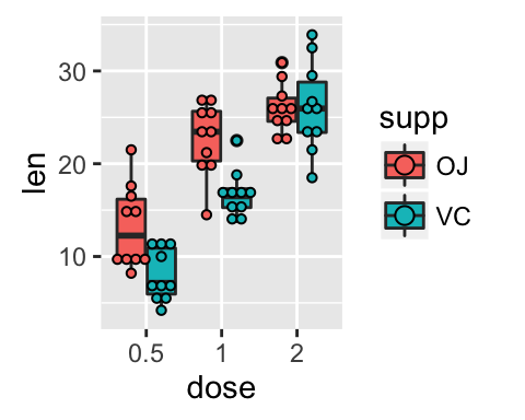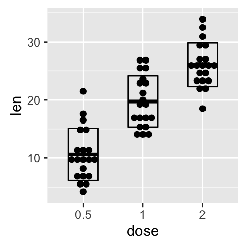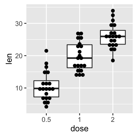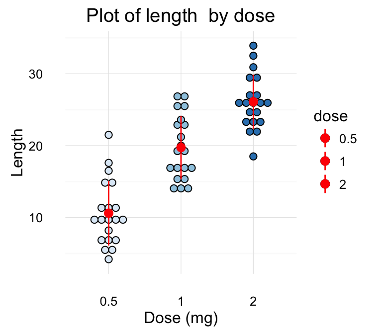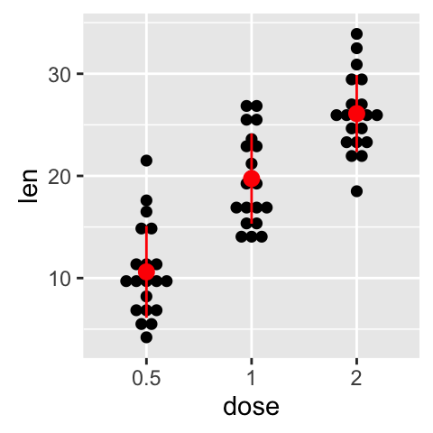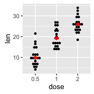 # dot plot with mean points p + stat_summary(fun.y=mean, geom="point", shape=18, size=3, color="red") # dot plot with median points p + stat_summary(fun.y=median, geom="point", shape=18, size=3, color="red")
