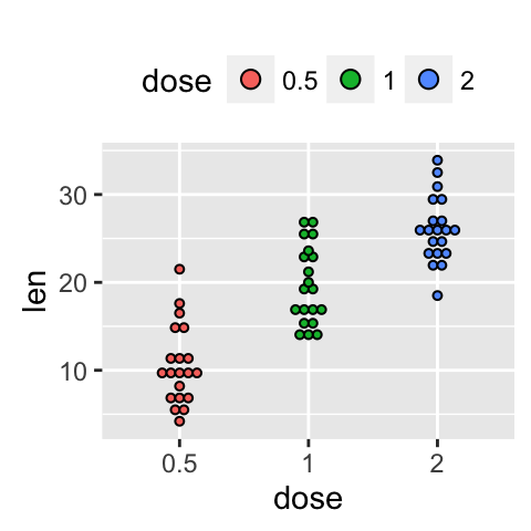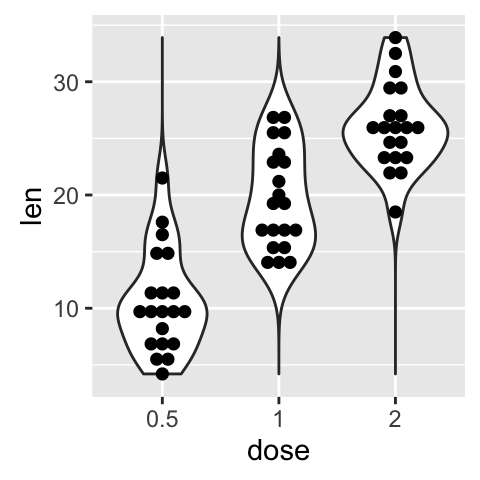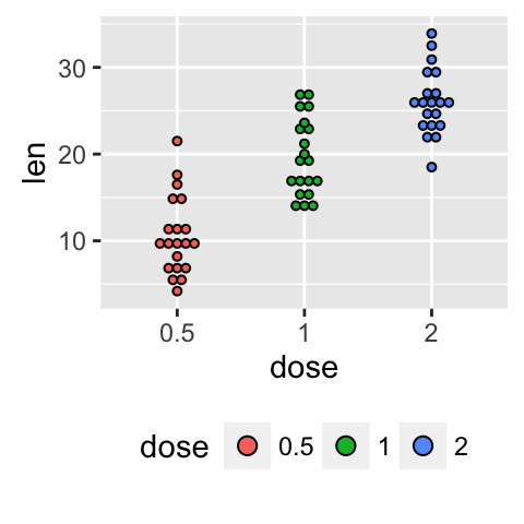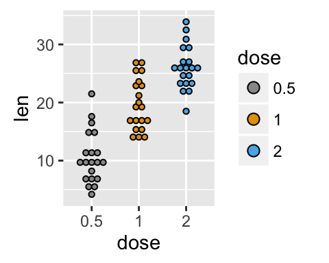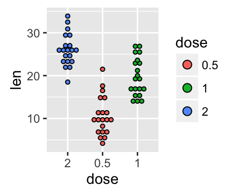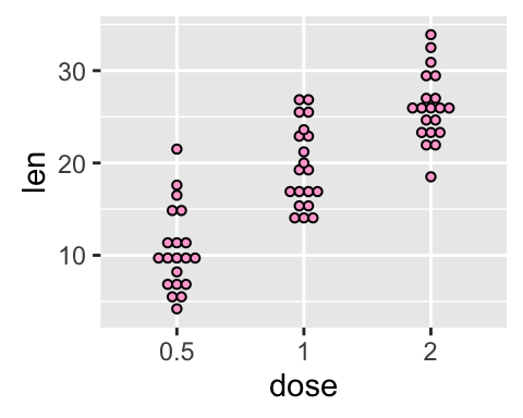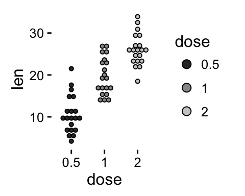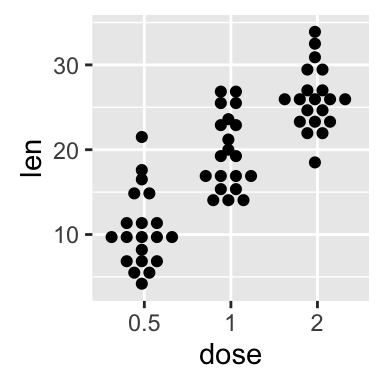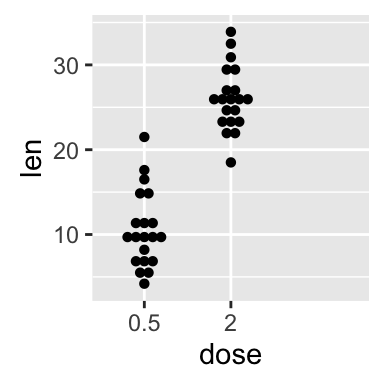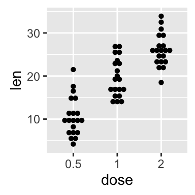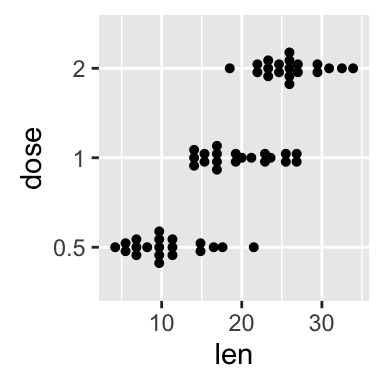 library(ggplot2) # Basic dot plot p<-ggplot(ToothGrowth, aes(x=dose, y=len)) + geom_dotplot(binaxis='y', stackdir='center') p # Change dotsize and stack ratio ggplot(ToothGrowth, aes(x=dose, y=len)) + geom_dotplot(binaxis='y', stackdir='center', stackratio=1.5, dotsize=1.2) # Rotate the dot plot p + coord_flip()