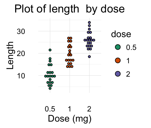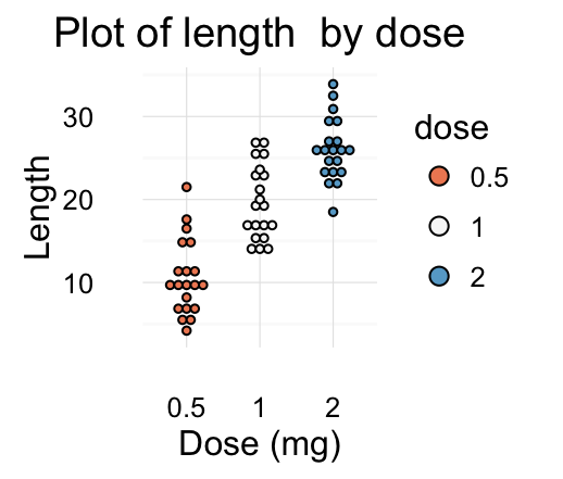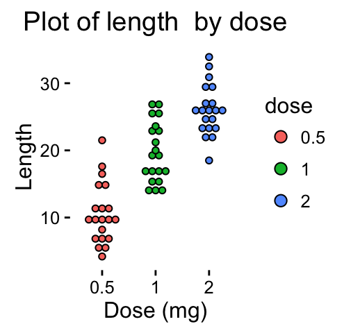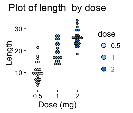 # Basic dot plot ggplot(ToothGrowth, aes(x=dose, y=len)) + geom_boxplot()+ geom_dotplot(binaxis='y', stackdir='center')+ labs(title="Plot of length by dose",x="Dose (mg)", y = "Length")+ theme_classic() # Change color by groups dp <-ggplot(ToothGrowth, aes(x=dose, y=len, fill=dose)) + geom_dotplot(binaxis='y', stackdir='center')+ labs(title="Plot of length by dose",x="Dose (mg)", y = "Length") dp + theme_classic()