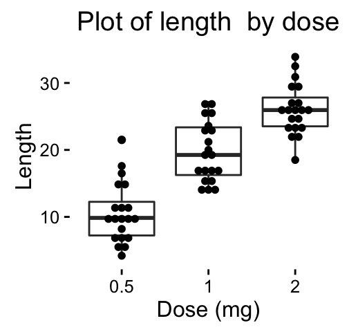 # Convert the variable dose from a numeric to a factor variable ToothGrowth$dose <- as.factor(ToothGrowth$dose) head(ToothGrowth) ## len supp dose ## 1 4.2 VC 0.5 ## 2 11.5 VC 0.5 ## 3 7.3 VC 0.5 ## 4 5.8 VC 0.5 ## 5 6.4 VC 0.5 ## 6 10.0 VC 0.5 Make sure that the variable dose is converted as a factor variable using the above R script.