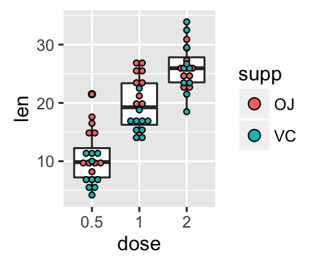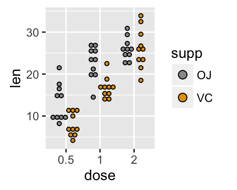 # Change colors p+scale_fill_manual(values=c("#999999", "#E69F00", "#56B4E9")) # Add box plots ggplot(ToothGrowth, aes(x=dose, y=len, fill=supp)) + geom_boxplot(fill="white")+ geom_dotplot(binaxis='y', stackdir='center') # Change the position ggplot(ToothGrowth, aes(x=dose, y=len, fill=supp)) + geom_boxplot(position=position_dodge(0.8))+ geom_dotplot(binaxis='y', stackdir='center', position=position_dodge(0.8))