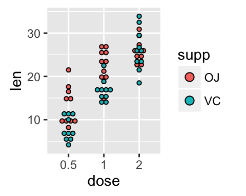 # Change dot plot colors by groups ggplot(ToothGrowth, aes(x=dose, y=len, fill=supp)) + geom_dotplot(binaxis='y', stackdir='center') # Change the position : interval between dot plot of the same group p<-ggplot(ToothGrowth, aes(x=dose, y=len, fill=supp)) + geom_dotplot(binaxis='y', stackdir='center', position=position_dodge(0.8)) p