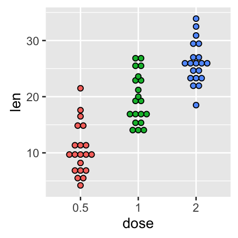 In the R code below, the fill colors of the dot plot are automatically controlled by the levels of dose :