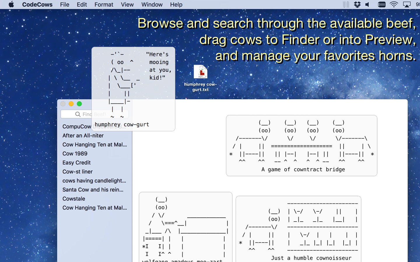 Other extras include a “Cow of the Day” widget for the macOS Notification Center, and broad copy&paste and drag&drop support (drag cows to the Finder, or into Preview, etc). Plus a beautiful “Radiactive” mode which makes the cows glow in the dark.