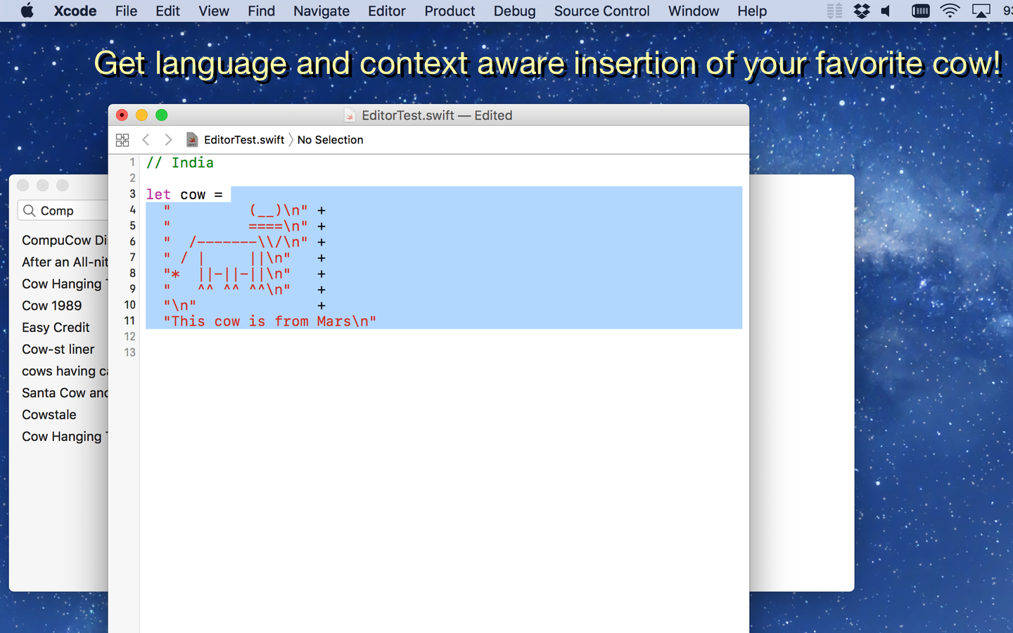 CodeCows is an Xcode extension which allows you to add hundreds of ASCII cows to your source code. The CowsyEditor extension is context-aware and detects whether you want to use a cow as a string, within a comment or elsewhere. It can insert a randow cow, a personalized cow-of-the-day, or one from the list of your favorite cows.