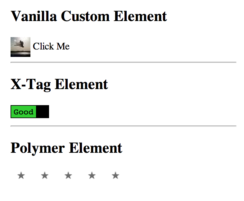 To look at interop, we're going to borrow the existing interop example Rob Dodson put together for Polymer and X-Tag. The basic idea here is "Click Me" represents a vanilla Custom Element which can then go and toggle the current state of the X-Tag Element and ratings of the Polymer element. Everyone plays together nicely.