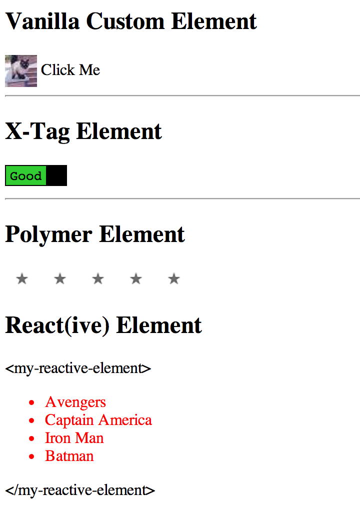 Note: Examples using the above Reactive element with native Custom Elements, Polymer and X-Tag are available.