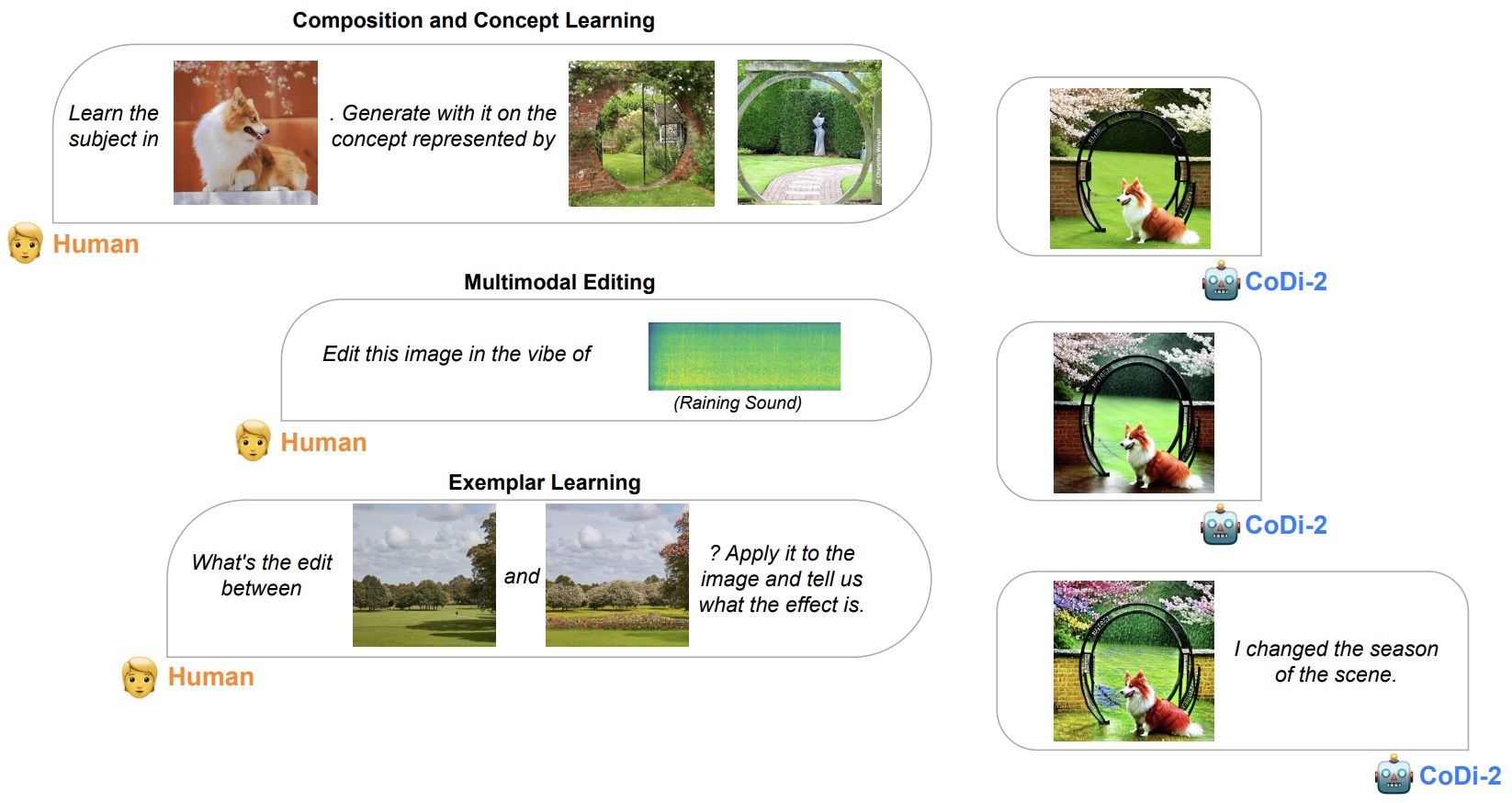 - The figure below from the paper shows multi-round conversation between humans and CoDi-2 offering in-context multimodal instructions for image editing.