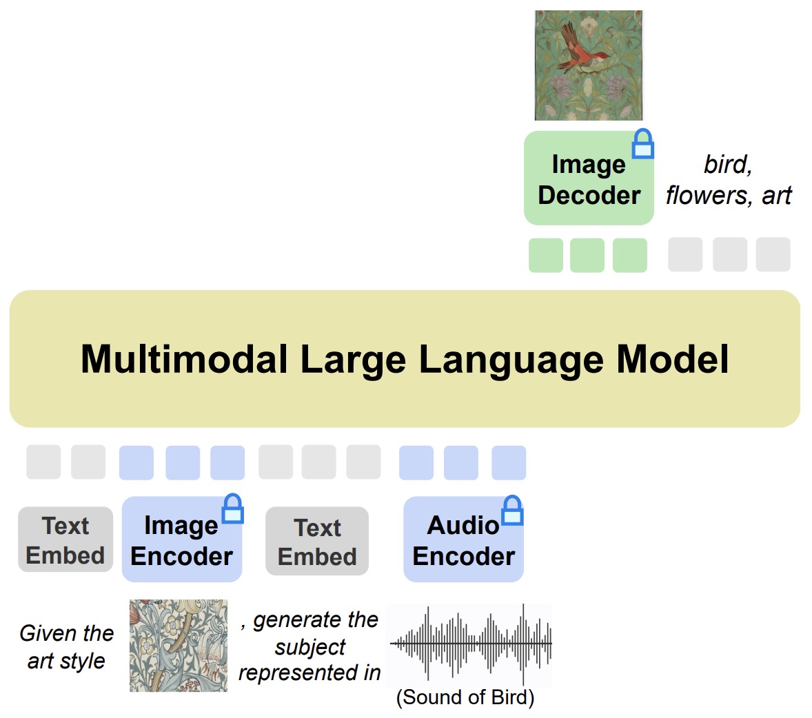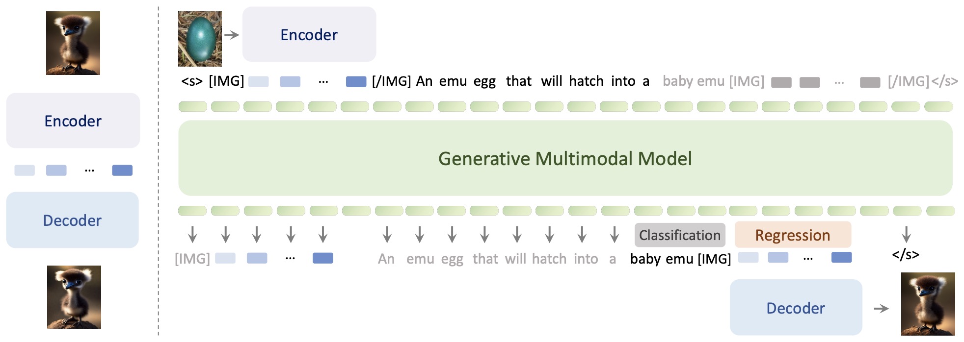 - Text Generation by MLLM: For generating text, the Multimodal Large Language Model (MLLM) naturally generates text tokens autoregressively.