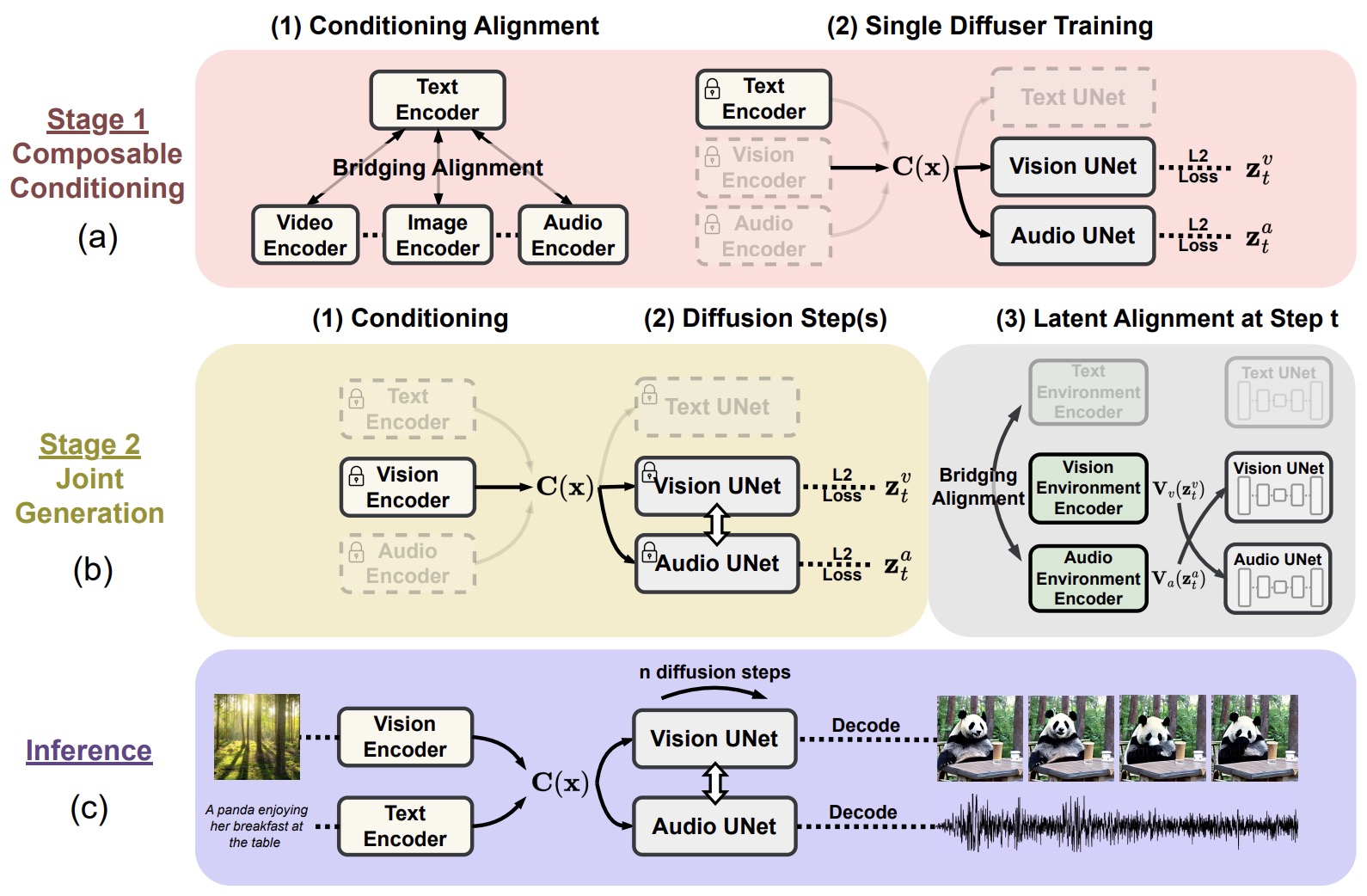 - The model employs a novel composable generation strategy. This involves building a shared multimodal space by bridging alignment in the diffusion process, enabling the synchronized generation of intertwined modalities, such as temporally aligned video and audio.
