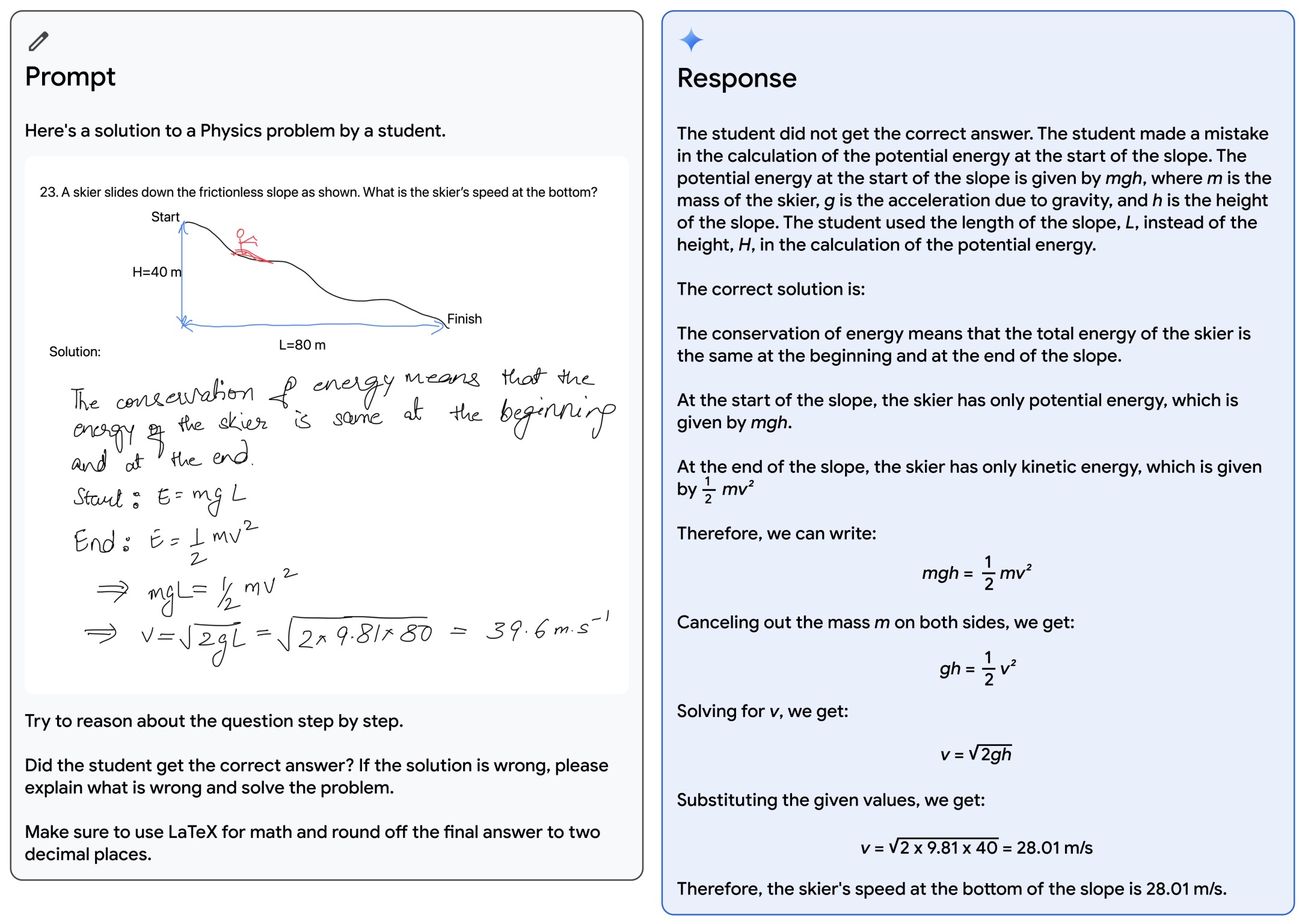 - Furthermore, in another instance, the figure below from the paper shows Gemini verifying a student’s solution to a physics problem. The model is able to correctly recognize all of the handwritten content and verify the reasoning. On top of understanding the text in the image, it needs to understand the problem setup and correctly follow instructions to generate LaTeX.