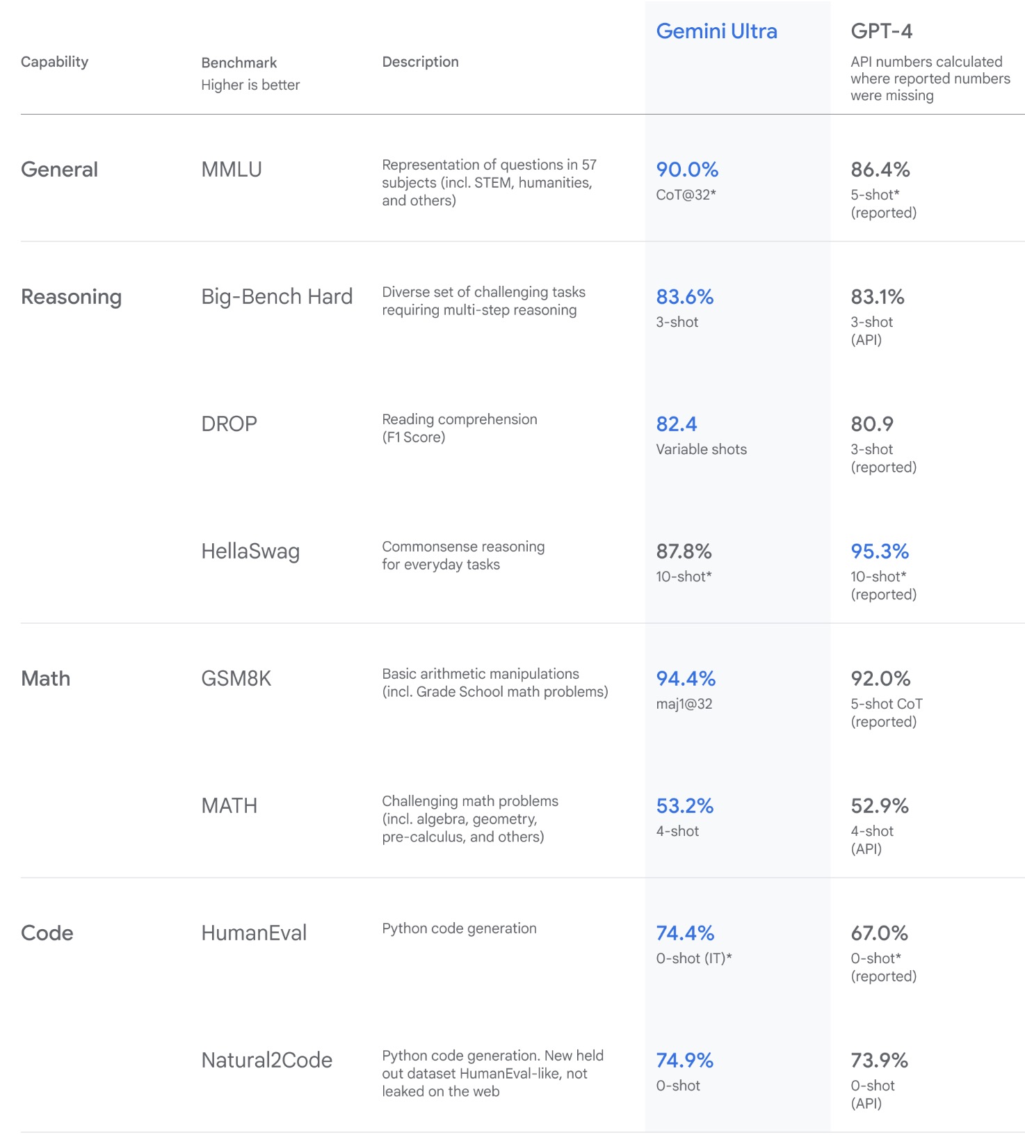 - Gemini outperforms OpenAI’s GPT-4 in 30 out of 32 benchmarks. Furthermore, it’s worth noting is that Gemini Ultra is the first model to outperform human experts on MMLU (massive multitask language understanding). The following table from Google’s blog Gemini surpasses state-of-the-art performance on a range of benchmarks including text and coding.