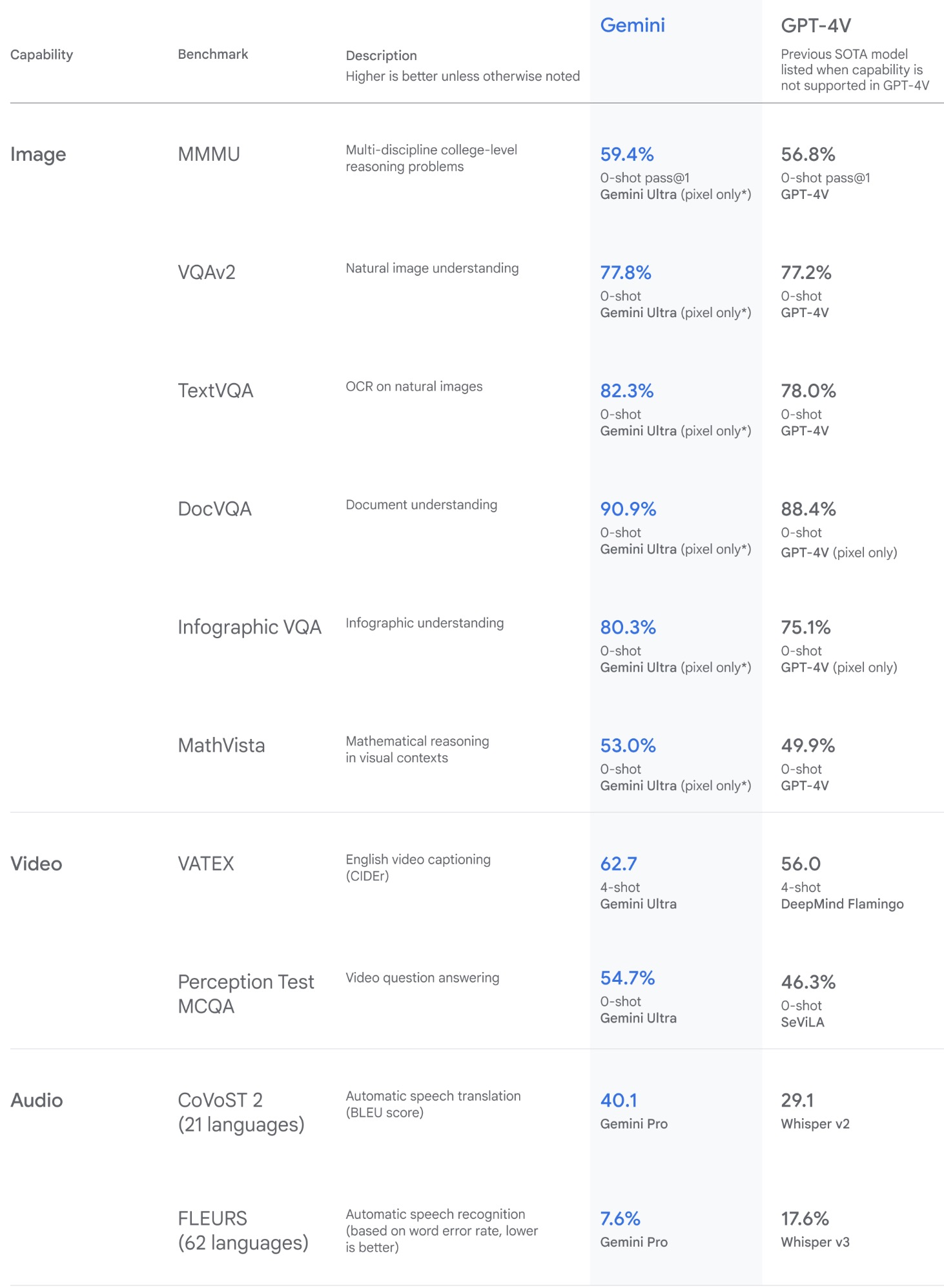 - For image understanding, Gemini Ultra sets new standards by outperforming existing models in zero-shot evaluations for OCR-related tasks. Its native multimodality and complex reasoning abilities enable it to excel in interpreting and reasoning with visual information. The following table from Google’s blog Gemini surpasses state-of-the-art performance on a range of multimodal benchmarks.