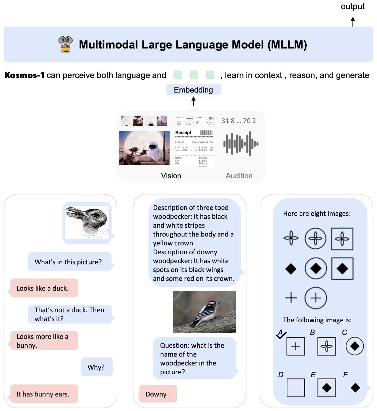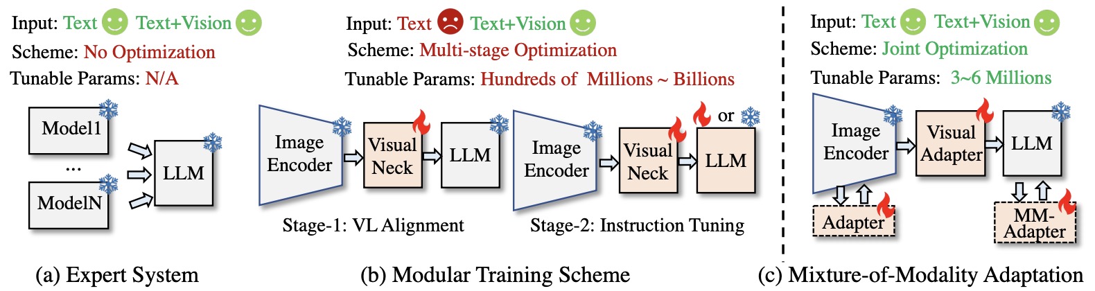 - The motivation of harnessing LLM is intuitively inspired by the observation that LLMs exhibit exceptional ability such as chatting, zero-shot learning, instruction following, etc., in language-only domain. By leveraging projections from aligned multimodal encoders, they seamlessly empower the LLM to perceive modality-interleaved input sequence. Specifically, in processing the multimodal input sequence, they first use the multimodal encoder to project the multimodal data into a feature sequence. Special tokens are prepended and appended to the features sequence, e.g.