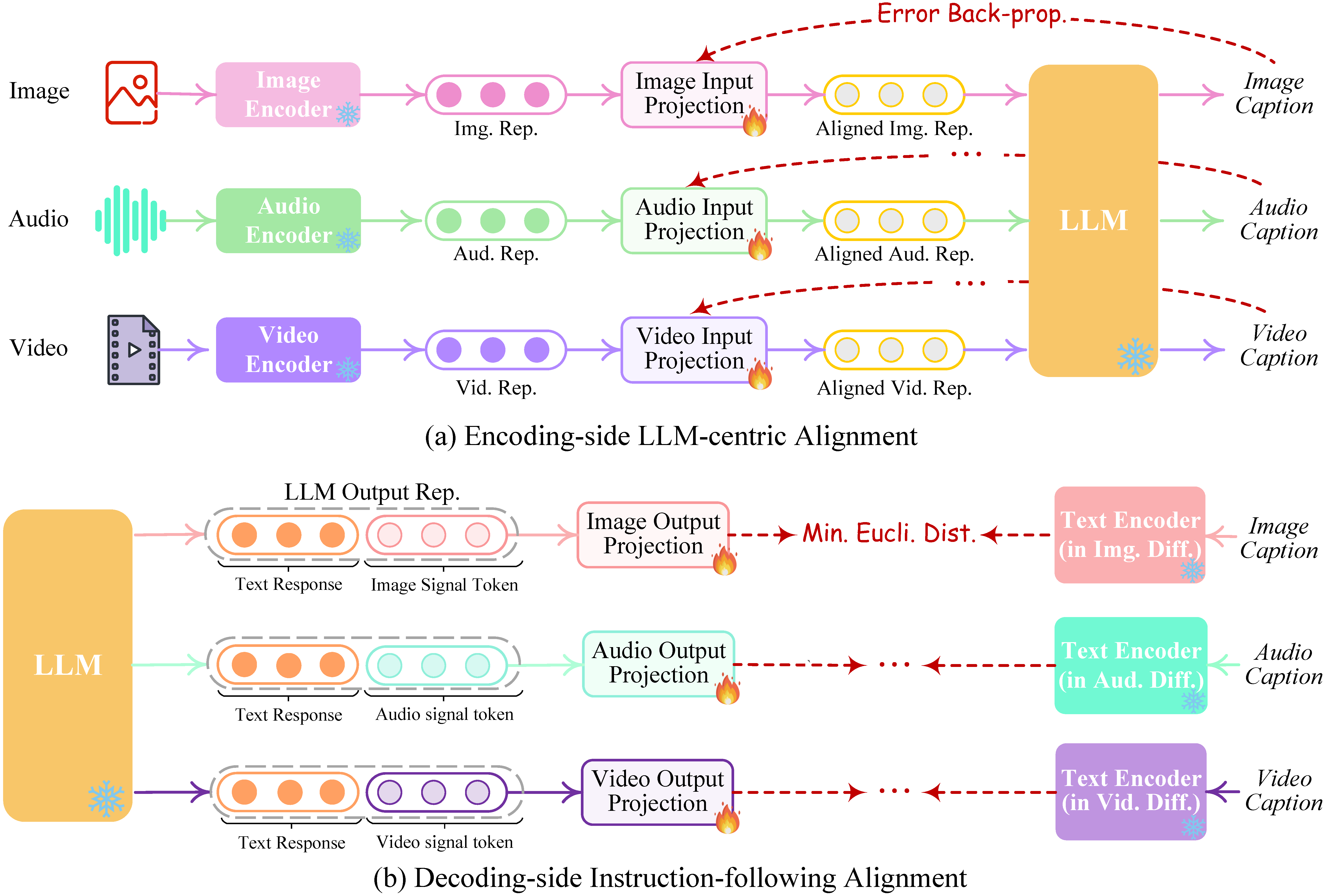 - Decoding-side Instruction-following Alignment: They minimize the distance between the LLM’s modal signal token representations (after each Transformer-based project layer) and the conditional text representations of the diffusion models. Since only the textual condition encoders are used (with the diffusion backbone frozen), the learning is merely based on the purely captioning texts, i.e., without any visual or audio inputs.