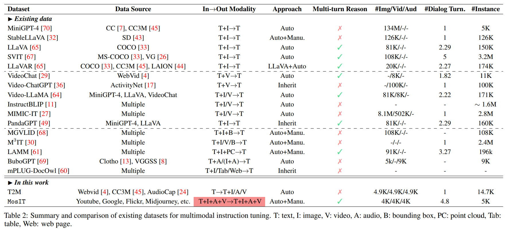 - The figure below from the paper offers a summary and comparison of existing datasets for multimodal instruction tuning. T: text, I: image, V: video, A: audio, B: bounding box, PC: point cloud, Tab: table, Web: web page.