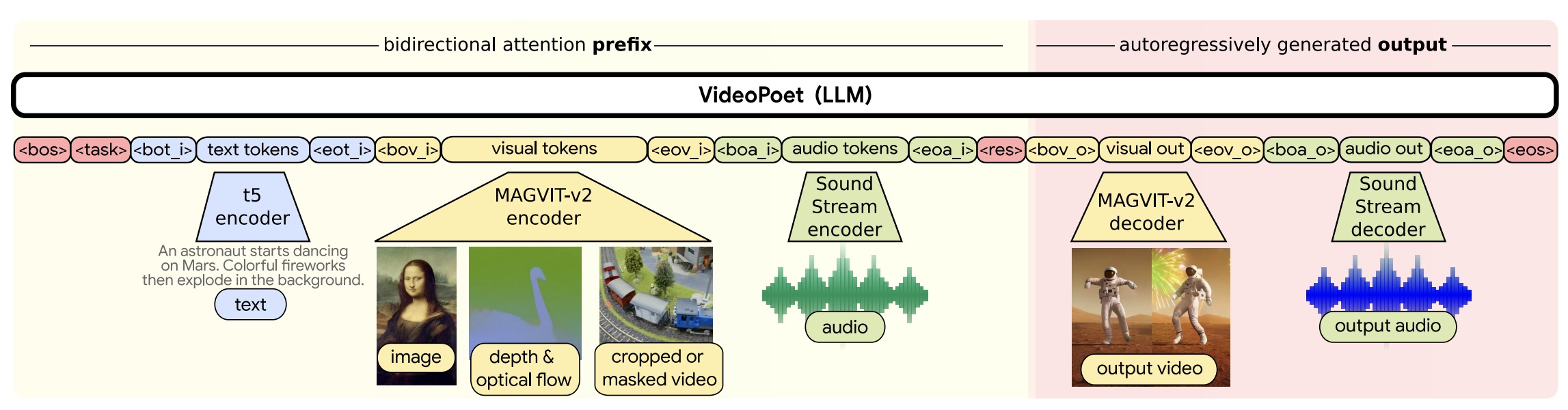 '<IMGi>'(i=0,…,4) as image signal tokens;'<AUDi>'(i=0,…,8) as audio signal tokens; and'<VIDi>'(i=0,…,24) as video signal tokens. After LLM, the text responses are output to the user; while the representations of the signal tokens of certain activated modalities are passed to the corresponding diffusion decoders for content generation.
