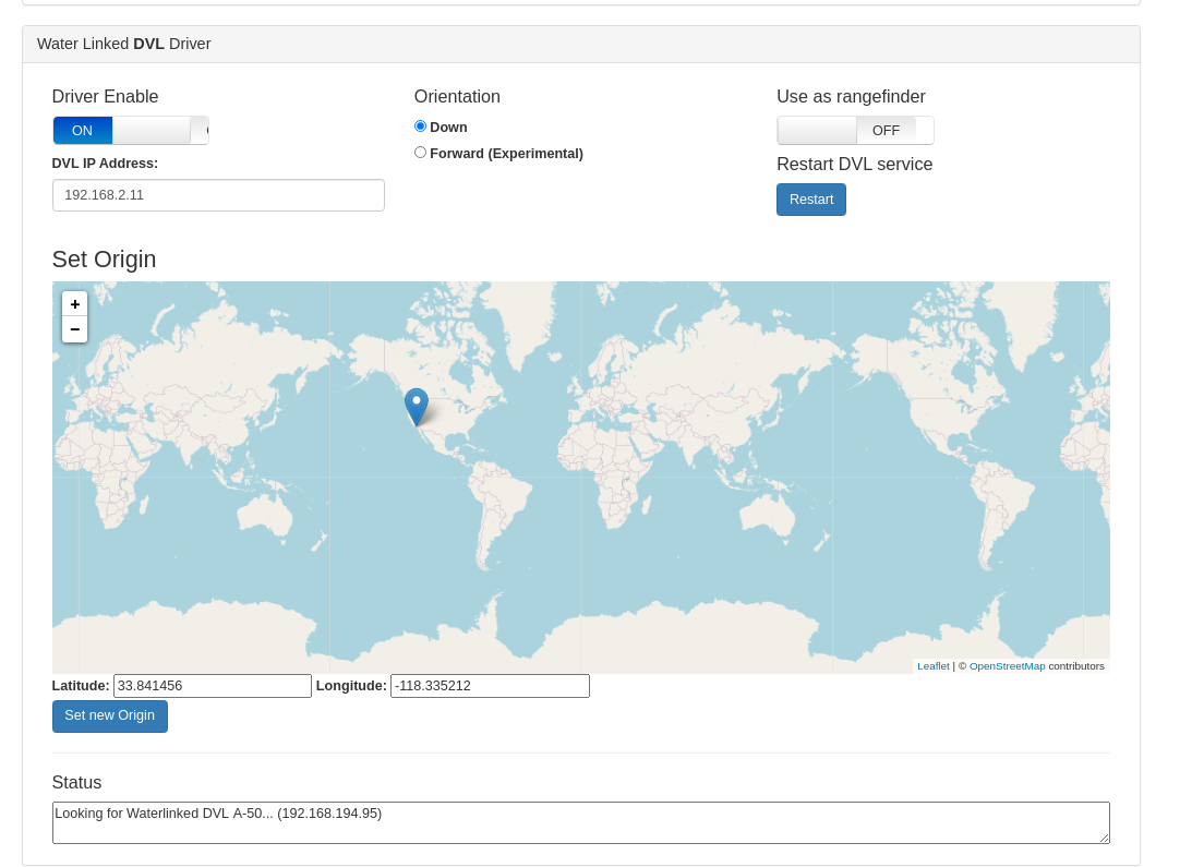 The DVL must be configured with a static IP address of 192.168.2.95. Follow Water Linked's instructions here.
