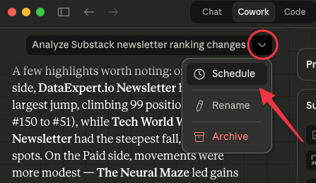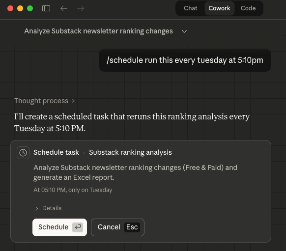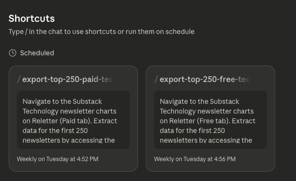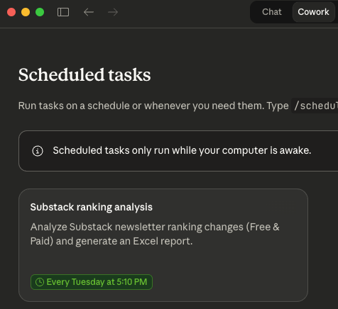 In the previous example, I used Claude in Chrome to set up a task that runs every Tuesday. It scrapes the data and generates a fresh dataset with a Substack newsletter ranking.