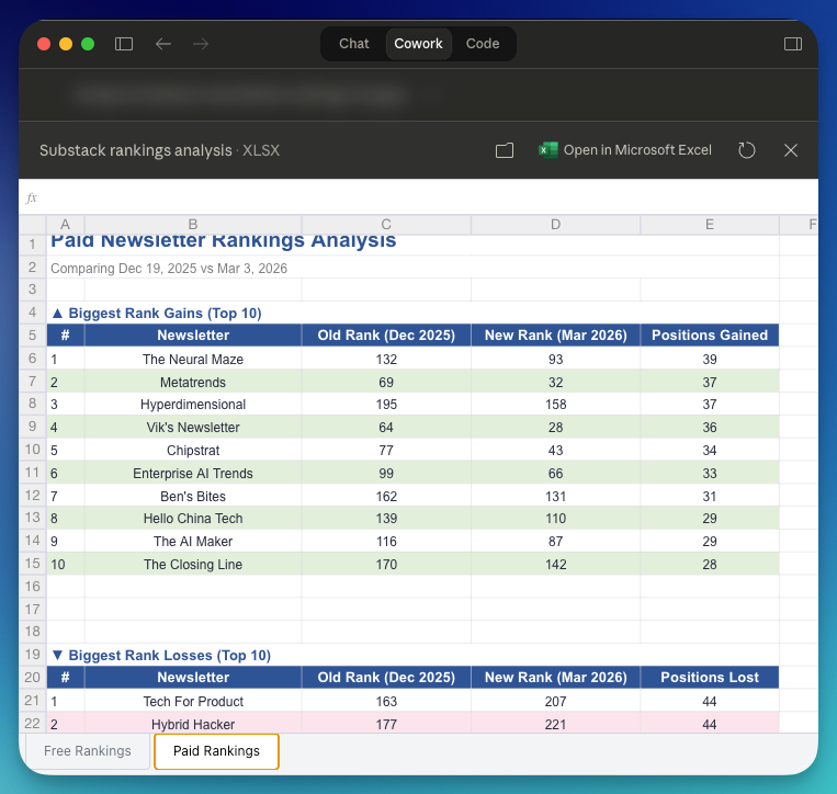 After running the task, Cowork drops a spreadsheet right in my folder with the full analysis. Congrats to the newsletters climbing fast … hope to be on the list soon :)
