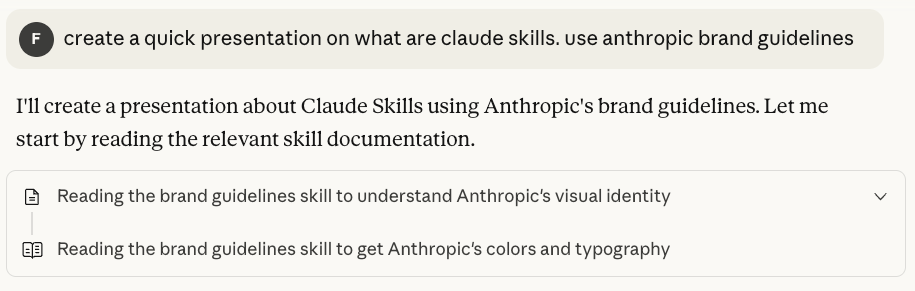 If you toggle on the skill brand-guidelines and try the prompt below, you’ll get slides with the Anthropic colors, design, etc (like the example I showed before).
