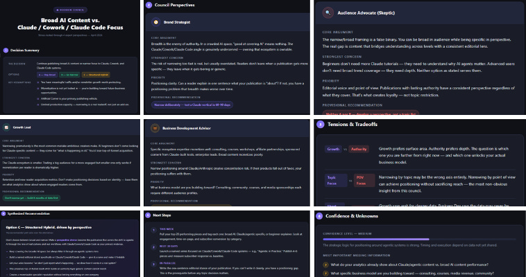 Decision Council runs multiple expert personas at the same time, each looking at your decision from a different angle. Then it brings them together into one synthesized recommendation with clear next steps.