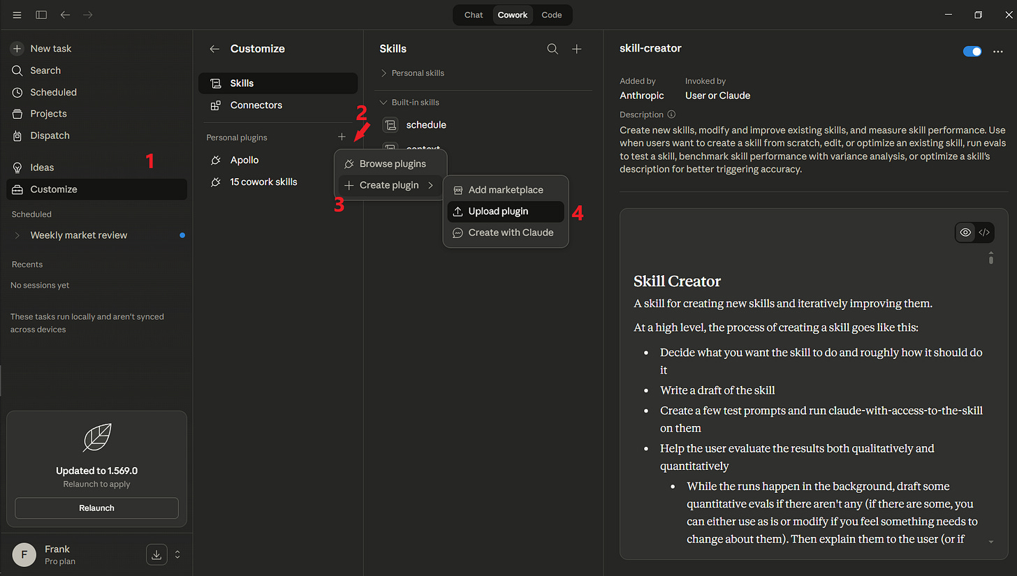 Customize → Skills → “+” → Create skill → Upload a skill → Upload your .zip or skill.md file