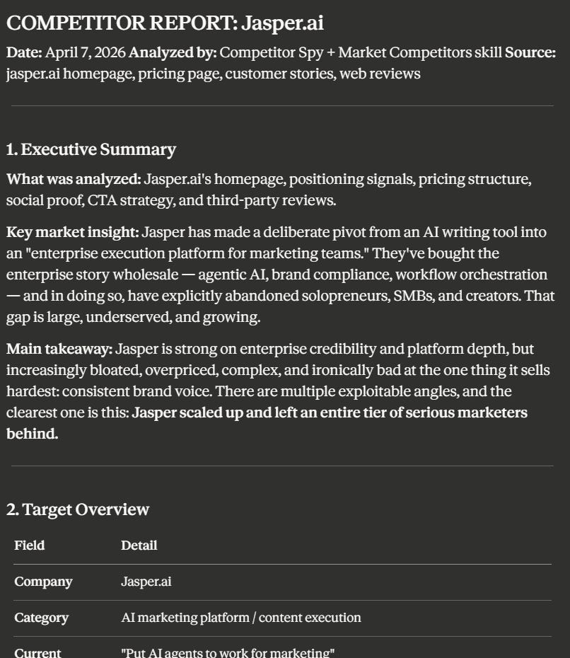 market-competitors takes a website or market input and turns it into a competitive intelligence report.