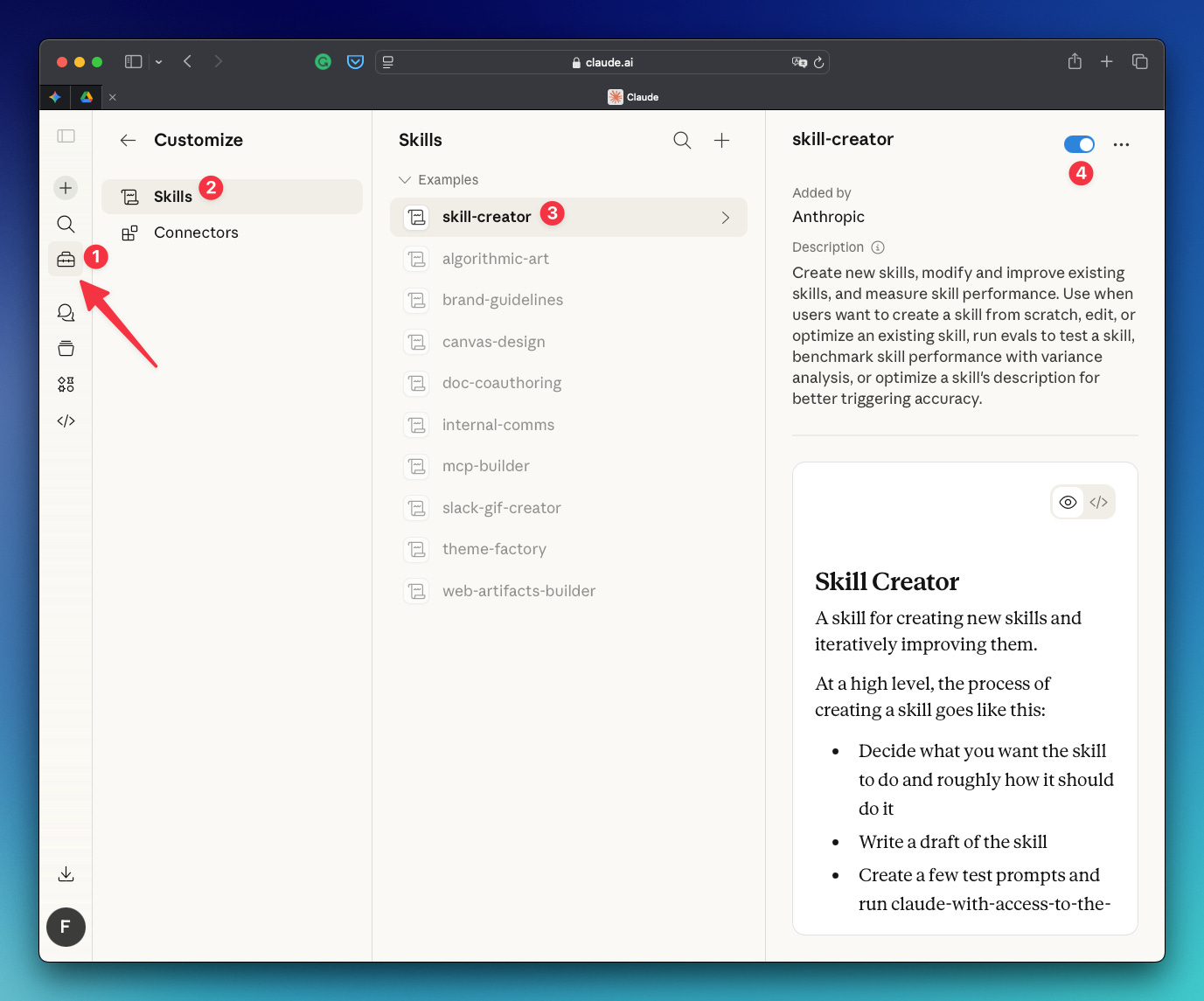 You don’t need to be technical to create a skill. Claude has a built-in skill creator that builds skills for you. Here’s how to enable the skill creator: