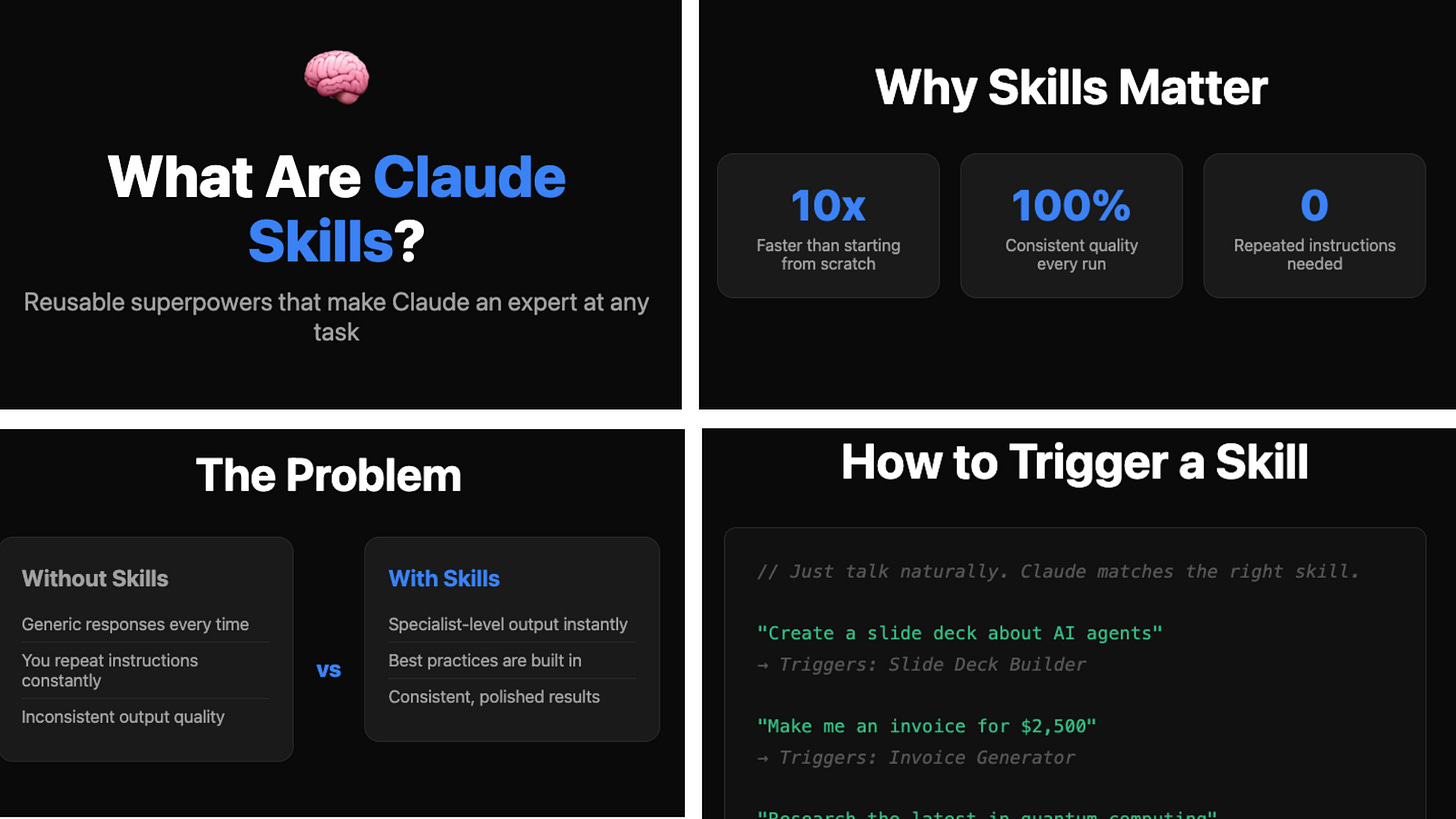 Skills is a feature that lets you create reusable instructions so Claude follows your standards — your brand colors, your formatting, your way of doing things (no more generic AI outputs).