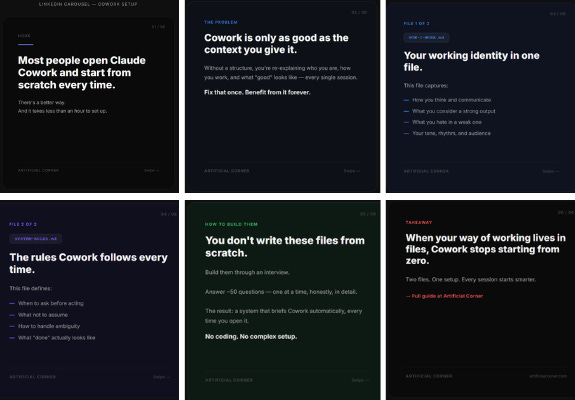 Not a generic post split into slides. A carousel shaped around your material, styled in a way that feels like something you’d actually publish — and could publish again next week without starting over.